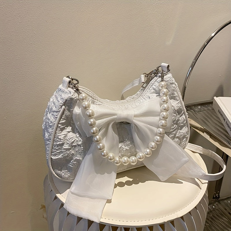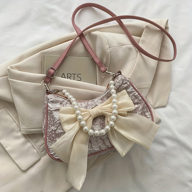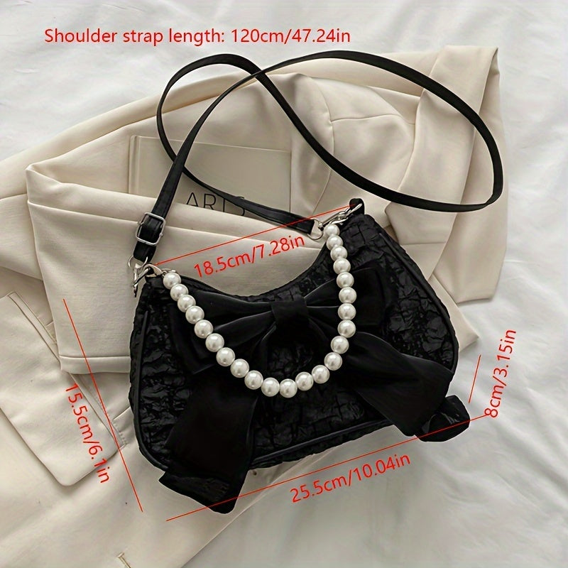 Black Crossbody Bag with Pearl Bow Zipper Closure Polyester Lining Vintage Style