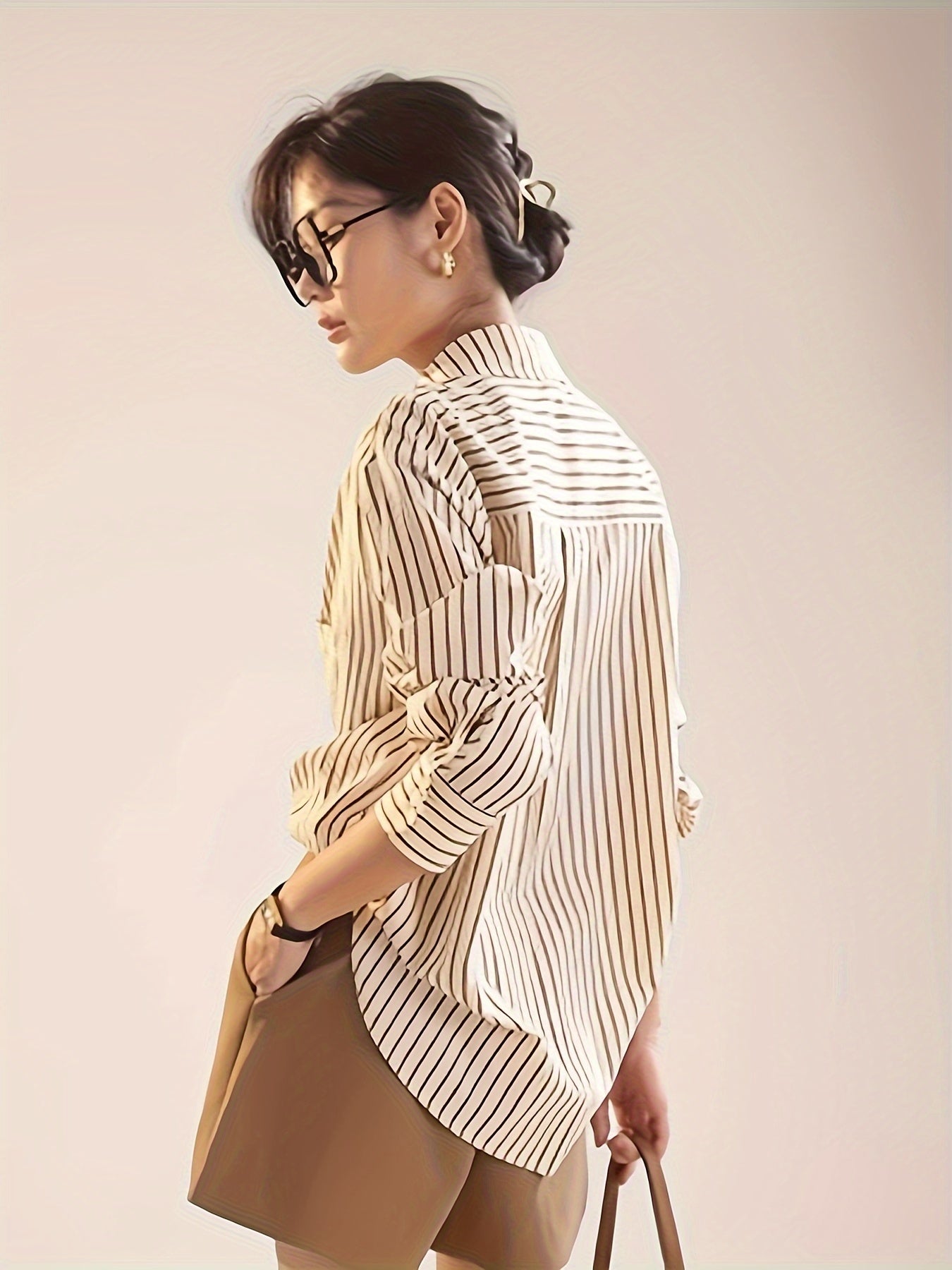 Women's Long Sleeve Striped Button-Up Shirt with Polo Collar for Spring Summer