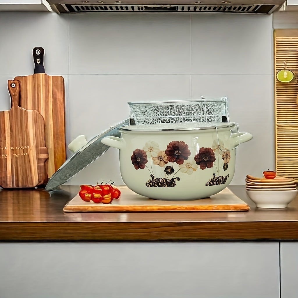 Enamel Fryer with Strainer Double-Ear Soup Pot High-Temperature Resistant for Stew and Cooking