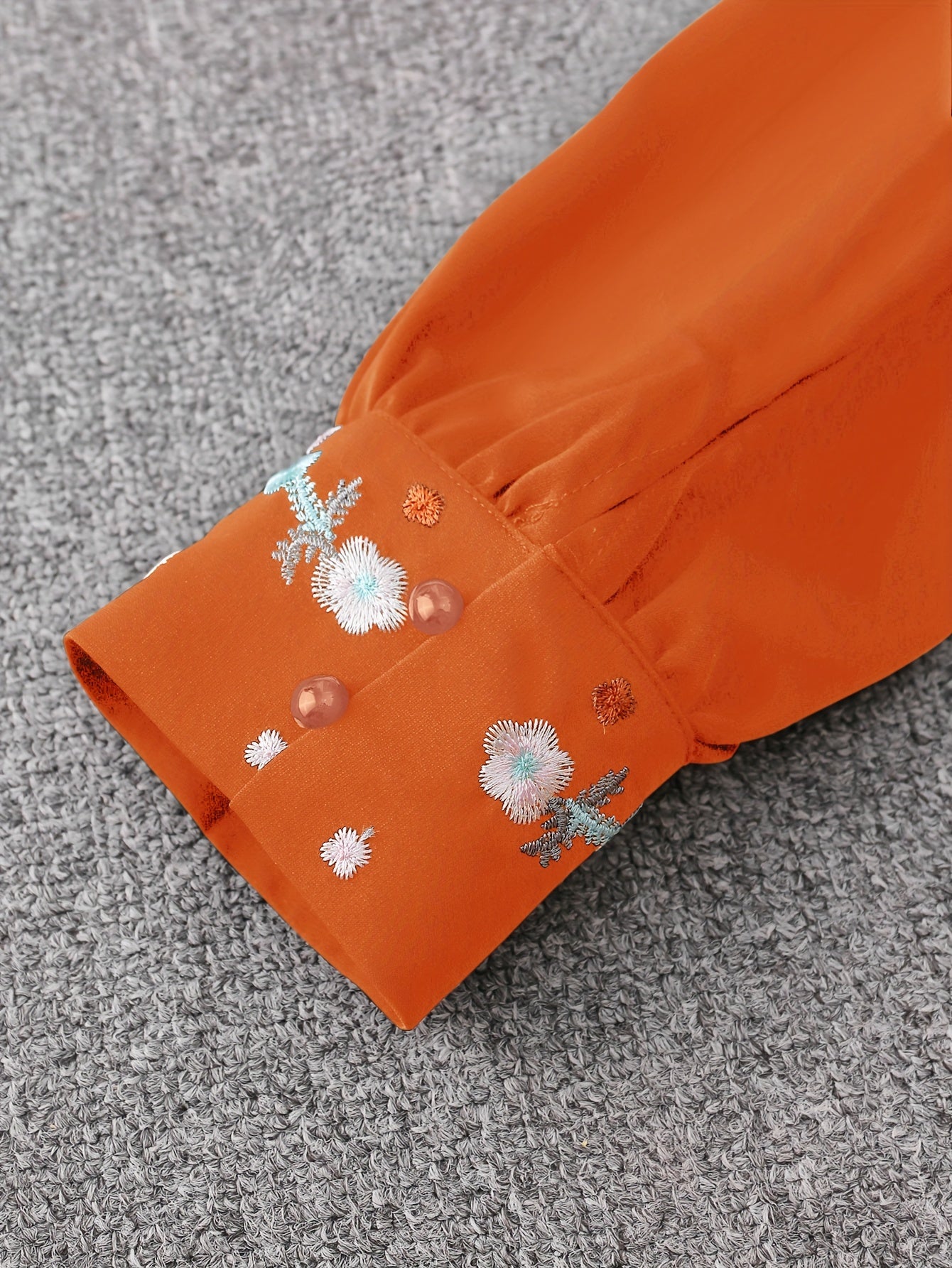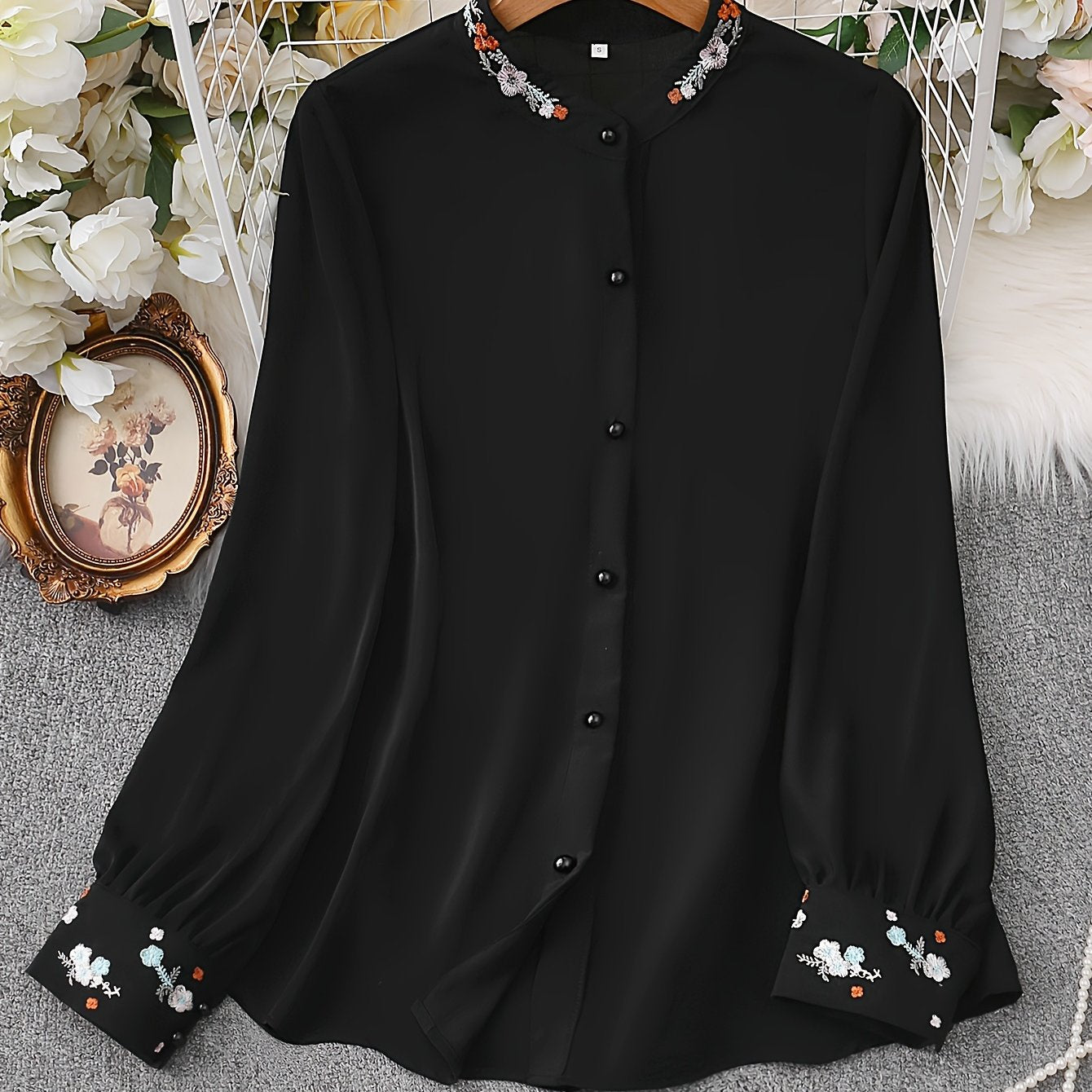 Women's Long Sleeve Embroidered Blouse with V-Neck and Button Front