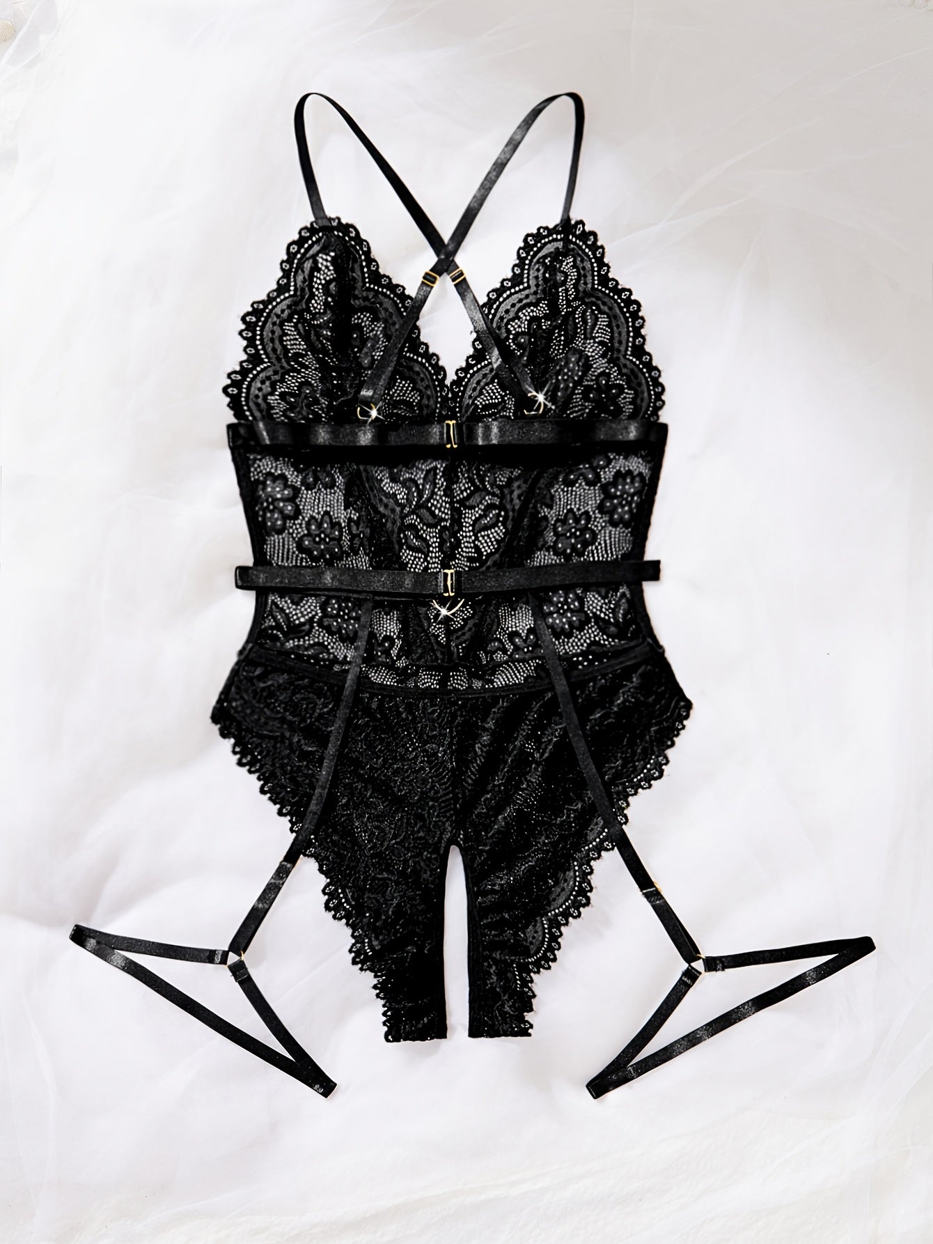 Women's Lace Crotchless Underwear Set with Backless Bodysuit and Garter Belt