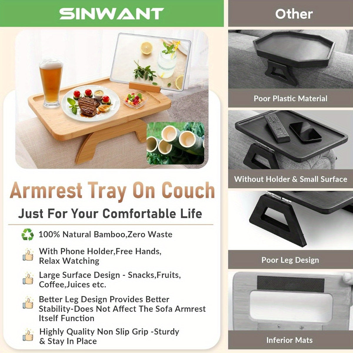 Foldable Bamboo Sofa Side Table with 360° Phone Holder for Snacks and Drinks
