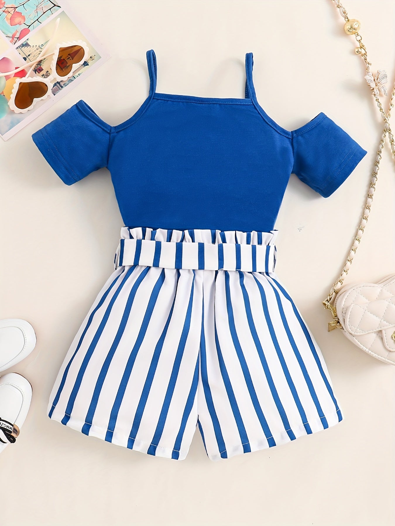 Girls' Summer Two-Piece Set Cami Top and Striped Shorts with Belt for Casual Outdoor Wear