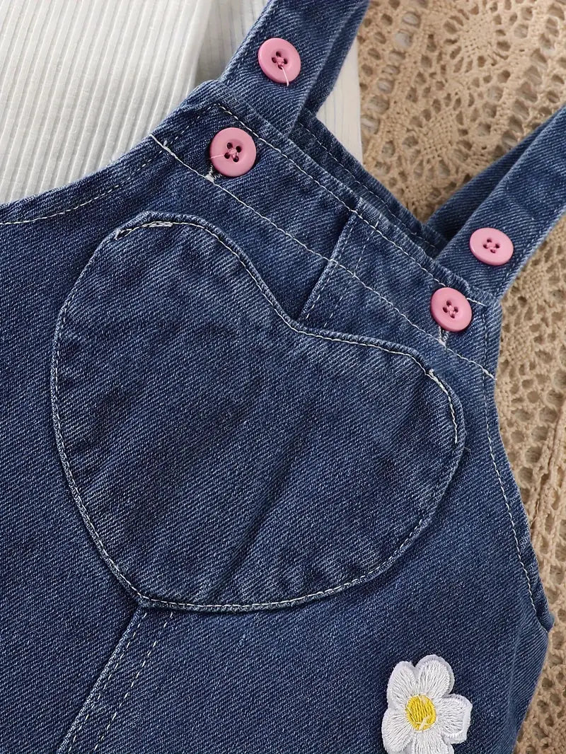 Girls Denim Dress Set with Embroidered Flowers and Long Sleeve Top for Infants