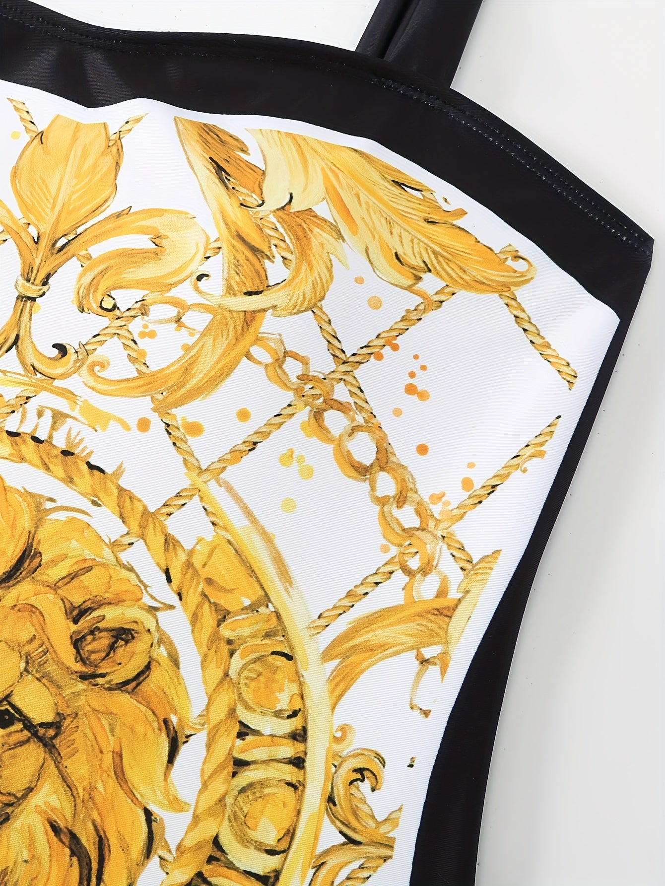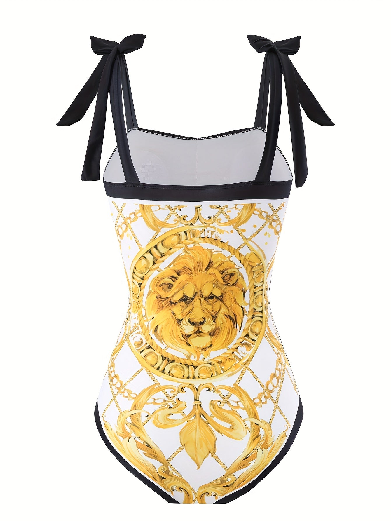 Golden Tone Lion Print Two-Piece Swimsuit with Bowknot Shoulder and Mesh Cover Up