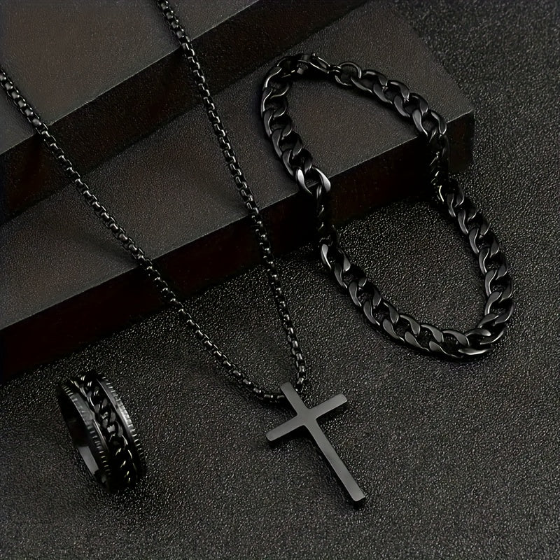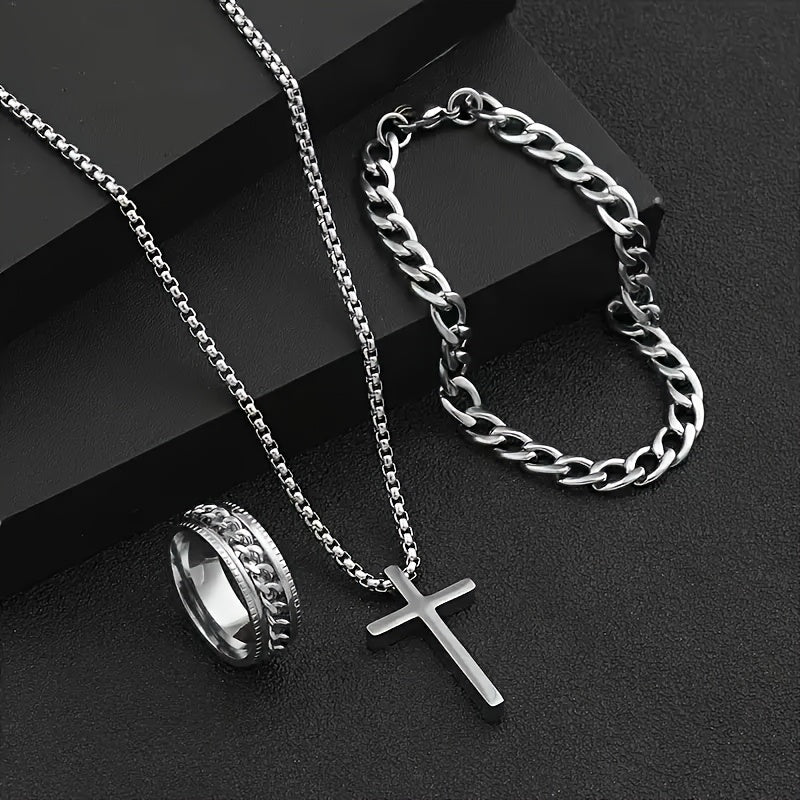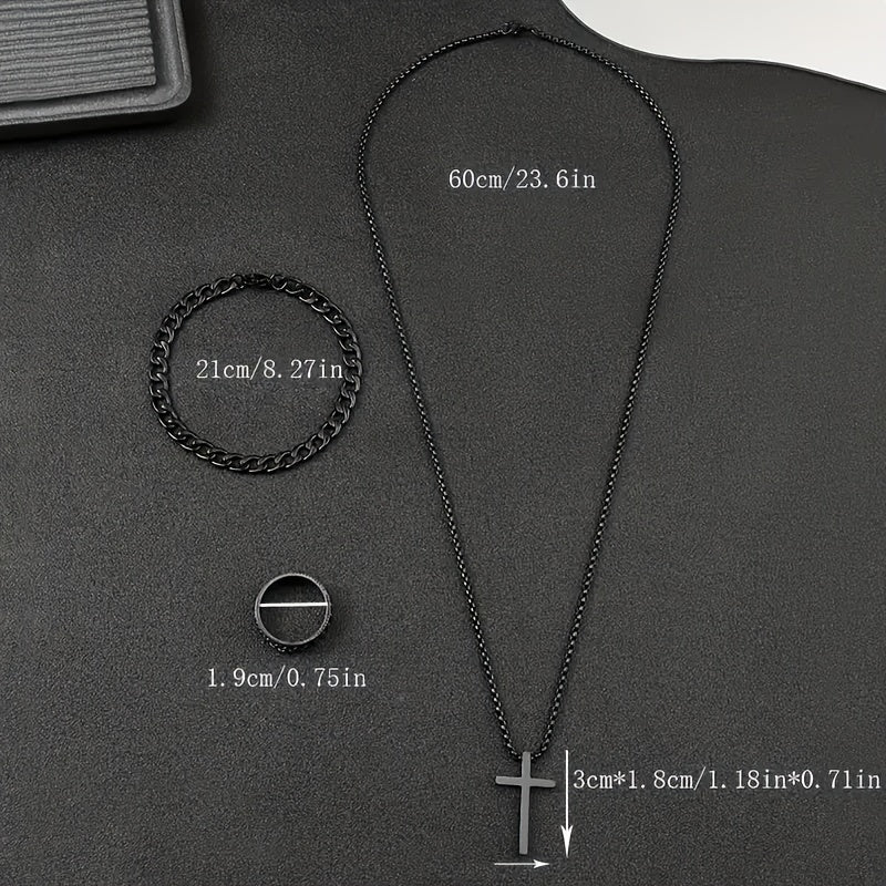 Hip-Hop Punk Style Men’s Jewelry Set Stainless Steel Necklace Bracelet Ring Cuban Link