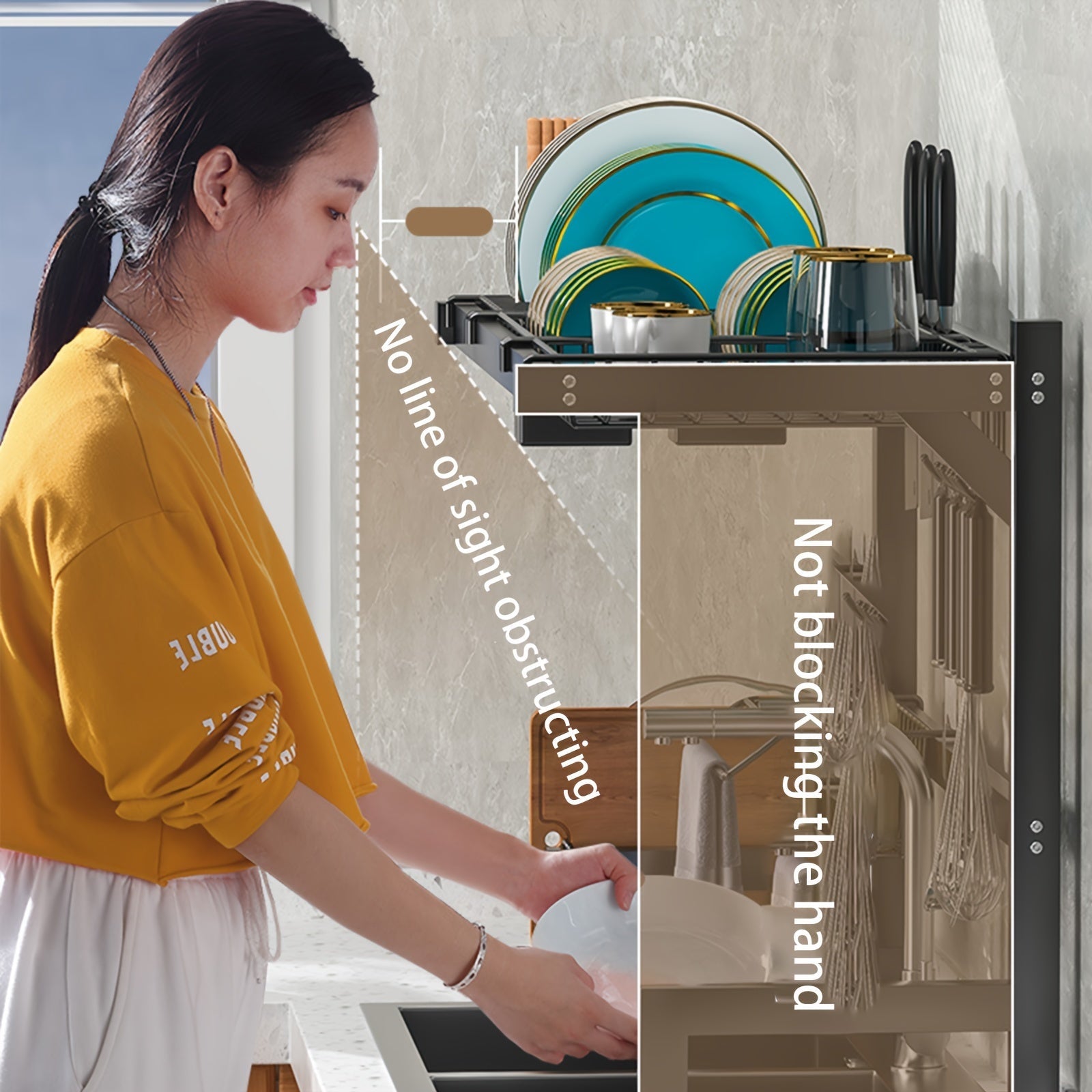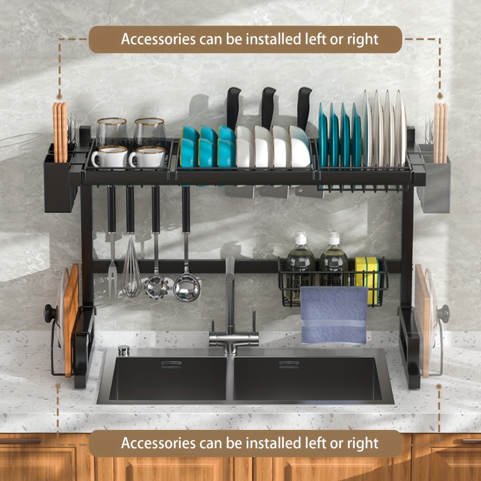 Large Black Metal Dish Drying Rack Over Sink with Detachable Shelf and Utensil Holder
