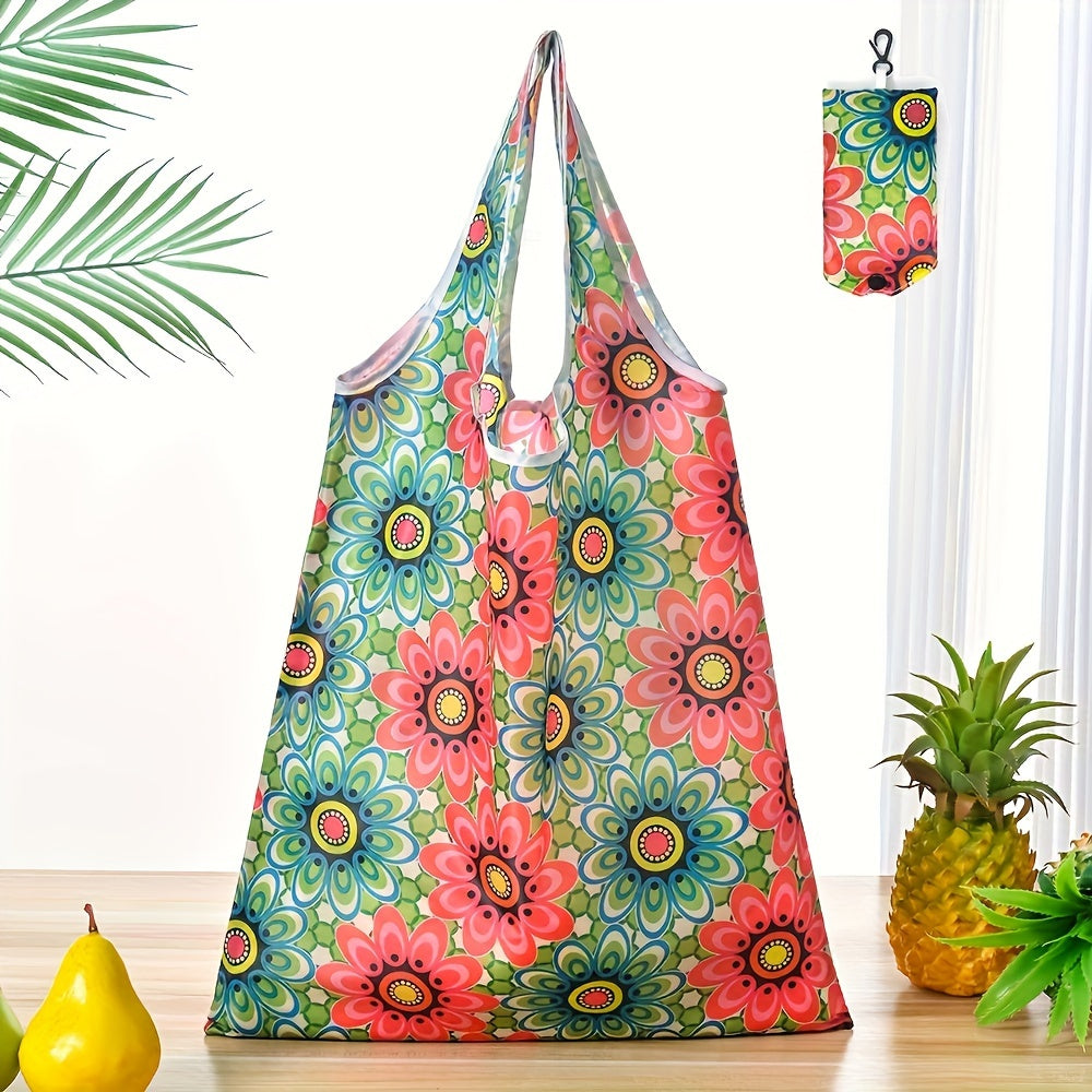 Large Foldable Tote Bag with Floral Pattern, Durable Polyester, Reusable Shopping