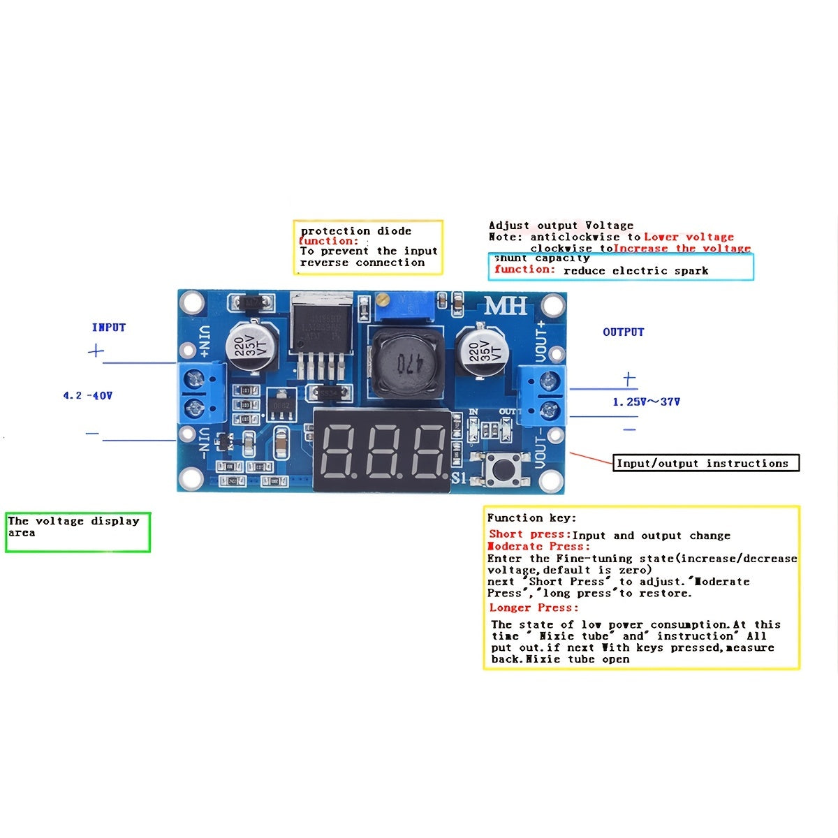 【Input Voltage】DC 4V to 40V ( Input Voltage Must 1.5V Higher Than Output Voltage or More, this is a step-down module, the input voltage is higher than the required output voltage. )【Output Voltage】DC 1.5V to 35V voltage is continuously adjustable, high efficiency (maximum 92%) of the maximum output current of 3A. (Do not reverse the input and output interface.)