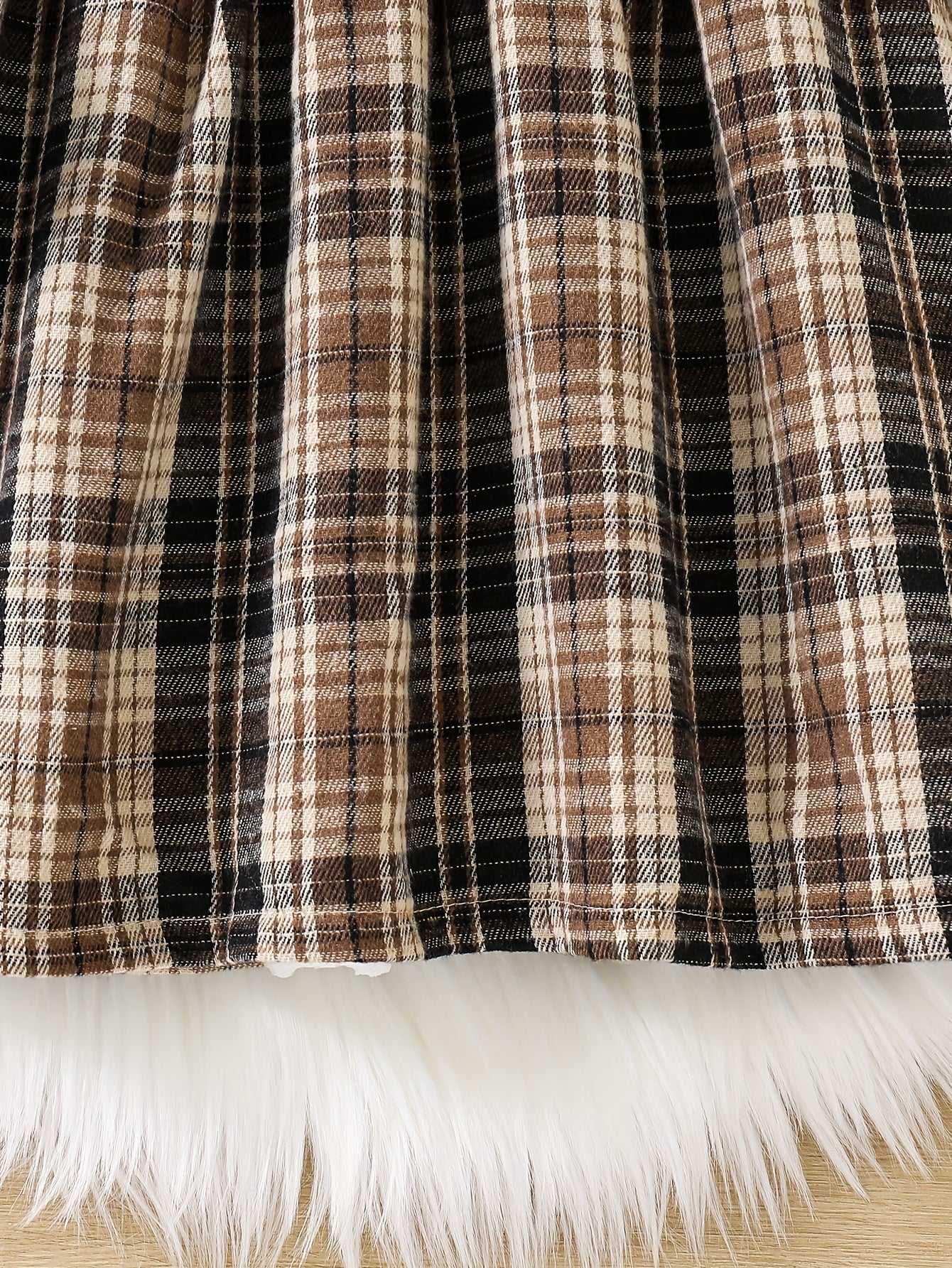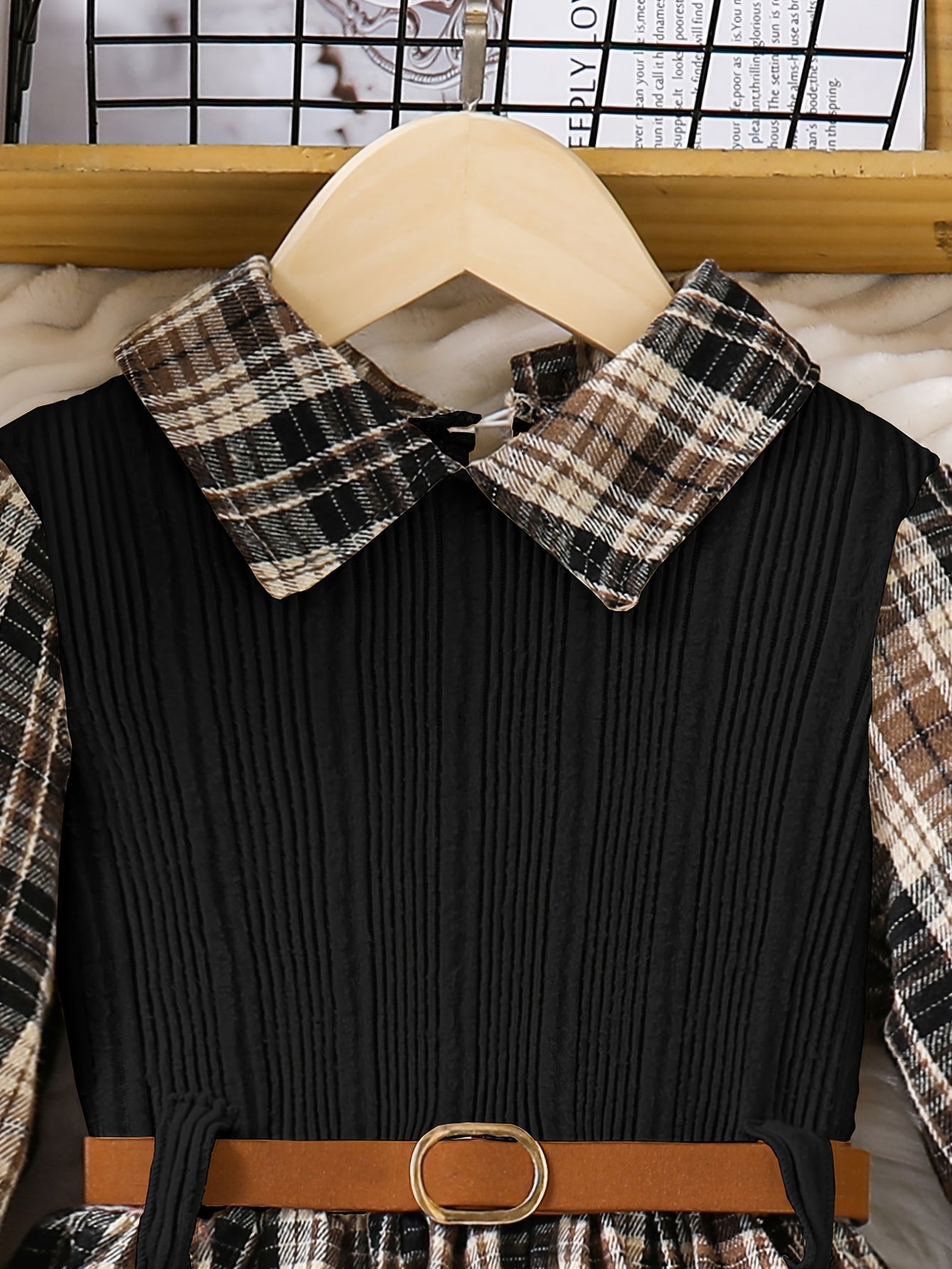 Girls' Long Sleeve Plaid Knit Dress with Belt for Spring and Fall