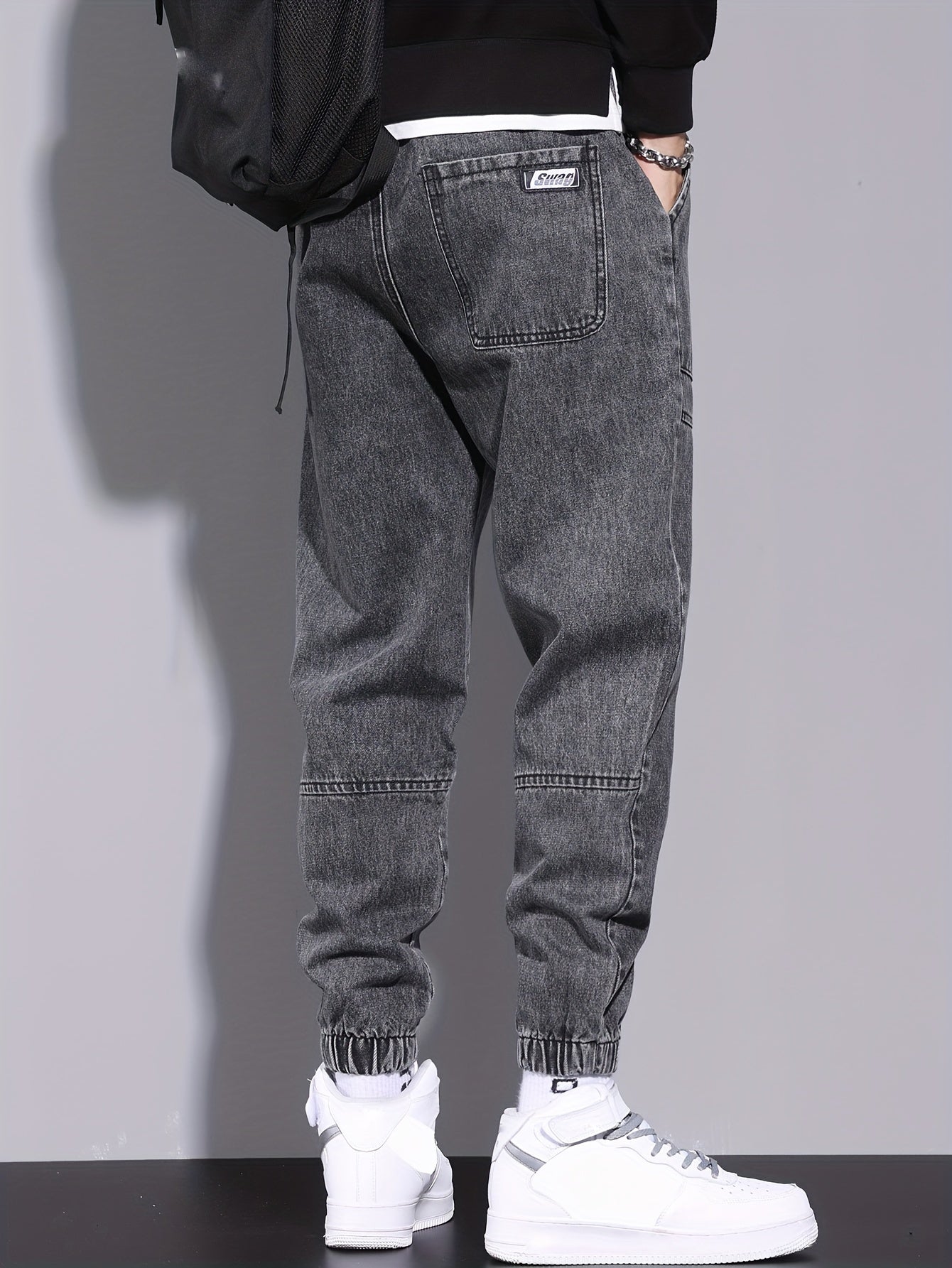 Men's Denim Jogger Pants with Elastic Drawstring Waist Cropped All-Season Street Style