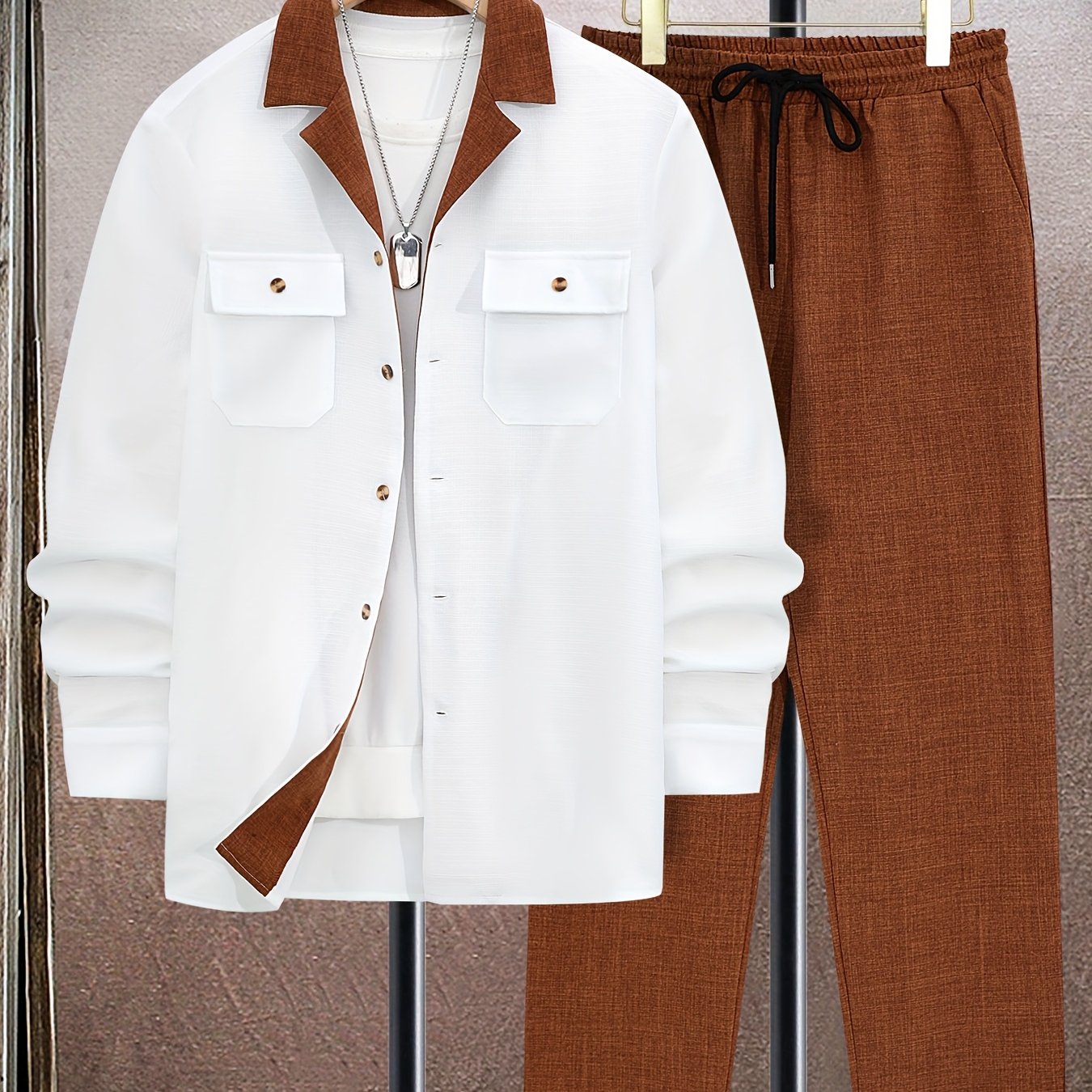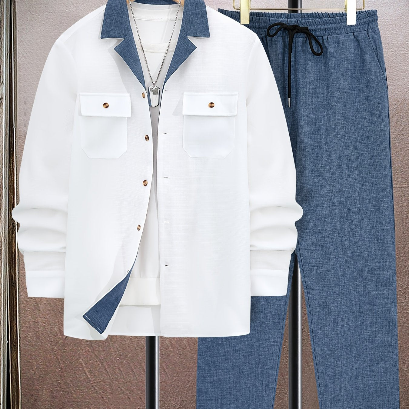 Men's Plus Size Olive Green Blazer Set Polyester Casual Button-Up Jacket with Pockets and Black Pants for Spring and Autumn