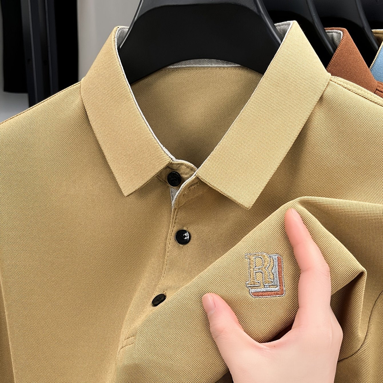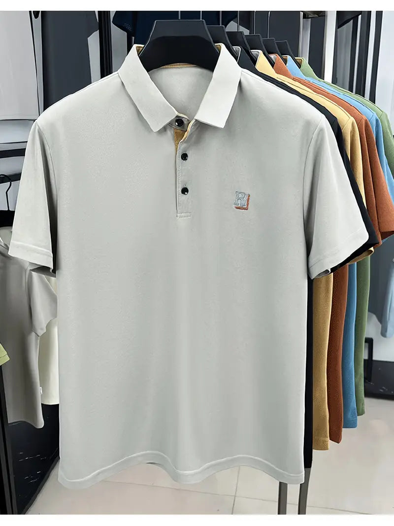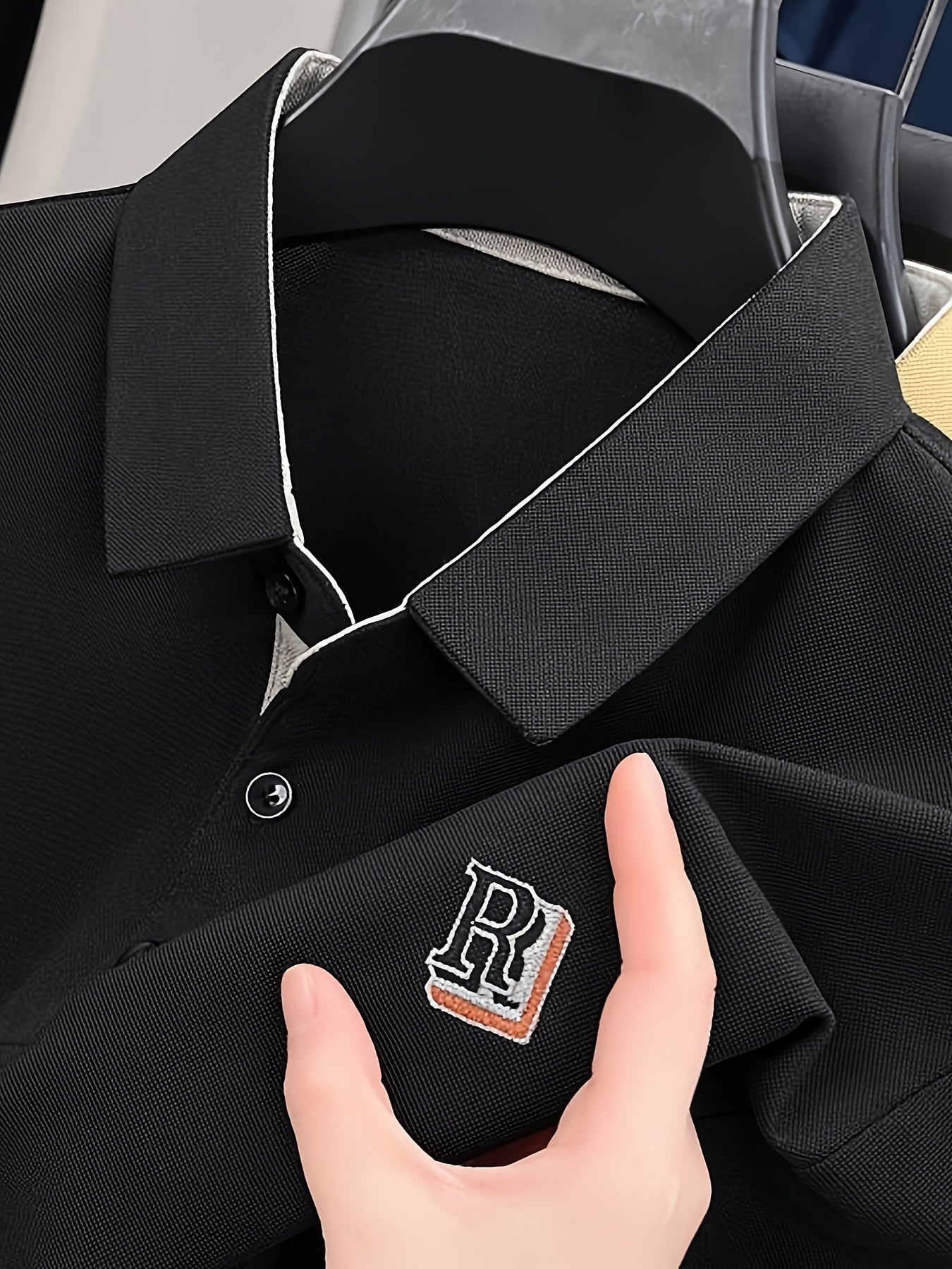 Men's Summer Casual Knitted Shirt Short Sleeve Embroidered Lettering Solid Color Breathable Fabric