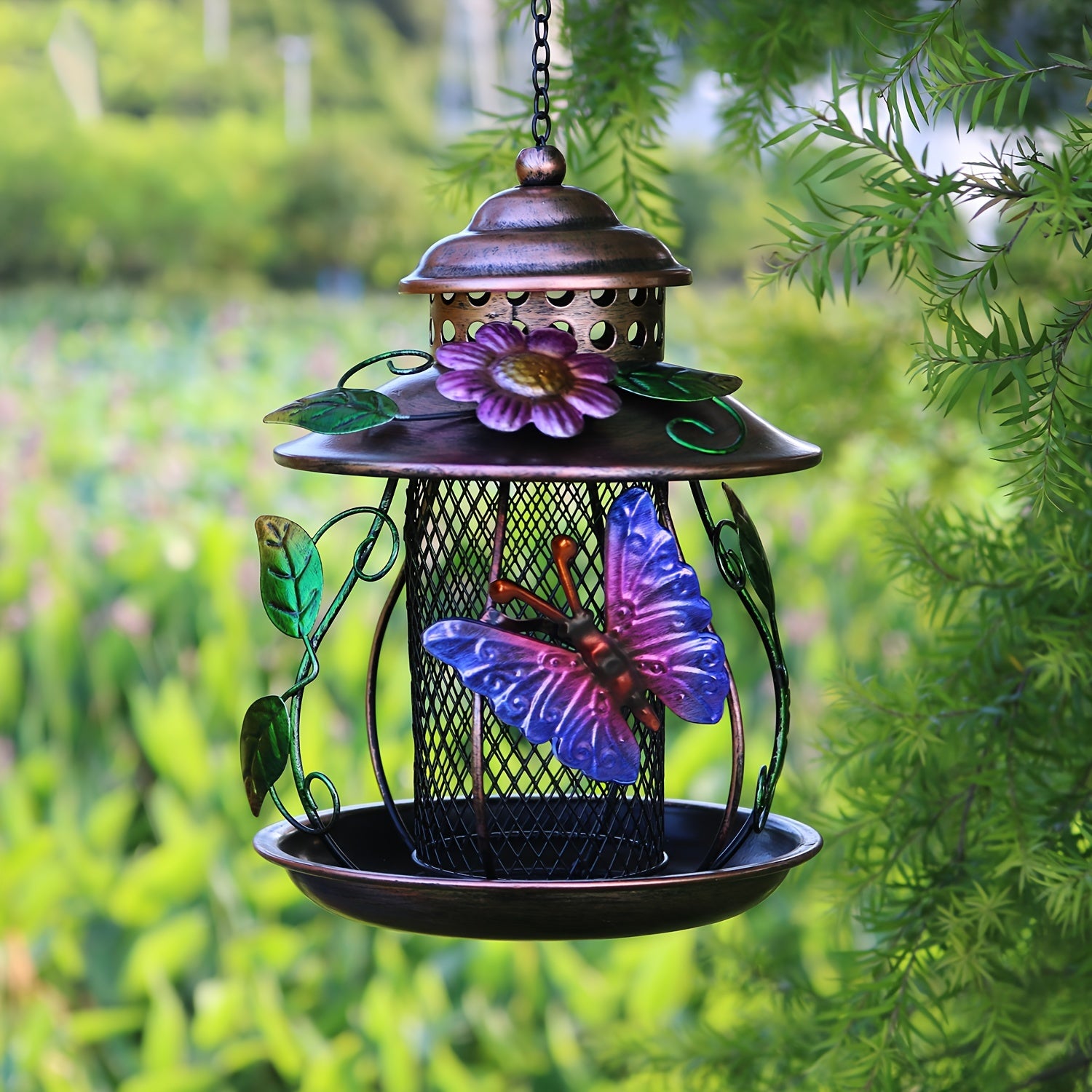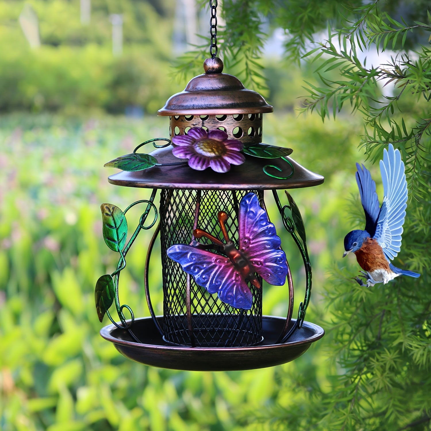 Metal Mesh Bird Feeder with Dragonfly and Flower Accents Outdoor Hanging Decor