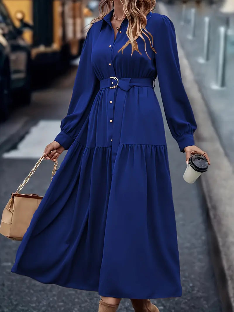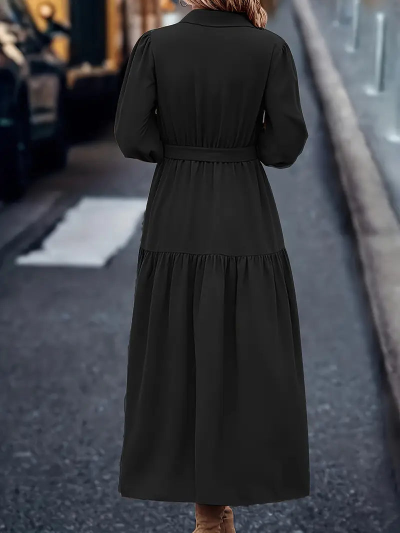 Women's Middle Eastern Style Polyester Shirt Dress with Lantern Sleeves and Ruffled Hem for Spring Fall