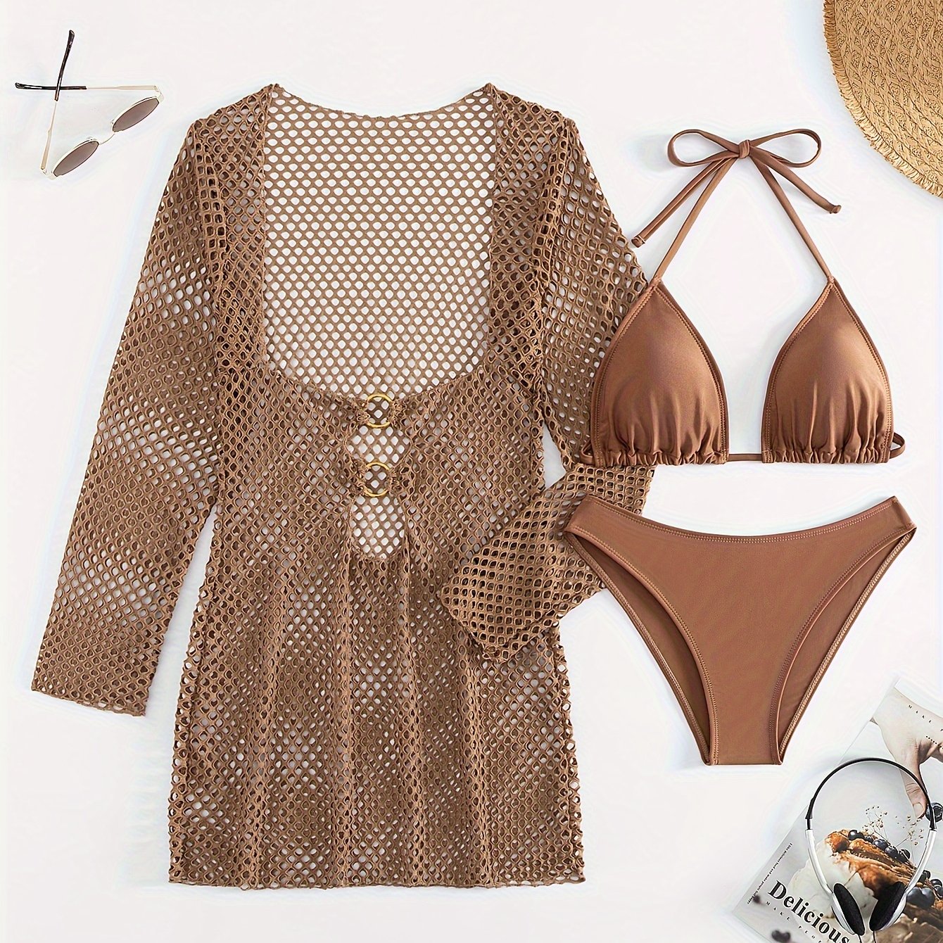 Women’s Halter Neck Bikini Set with Sheer Cover-Up Polyester Spandex High Stretch