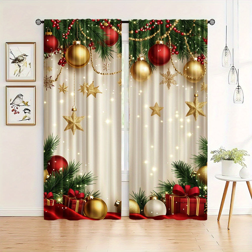 Pair of 2 Golden Christmas Pattern Digital Print Curtains Polyester for Living Room Home Decor