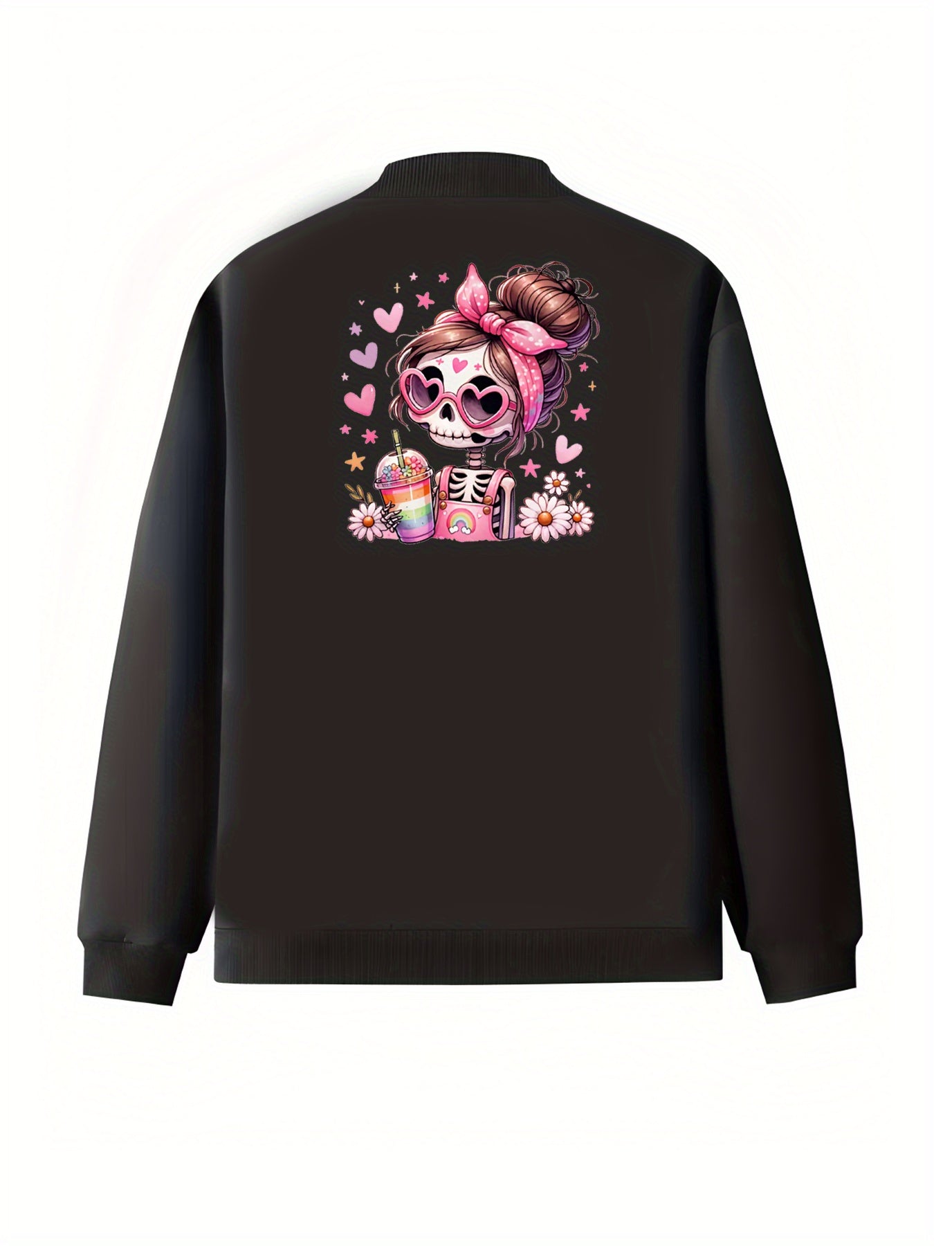 Plus Size Women's Black Baseball Collar Jacket with Skull Print Long Sleeve Zip Up