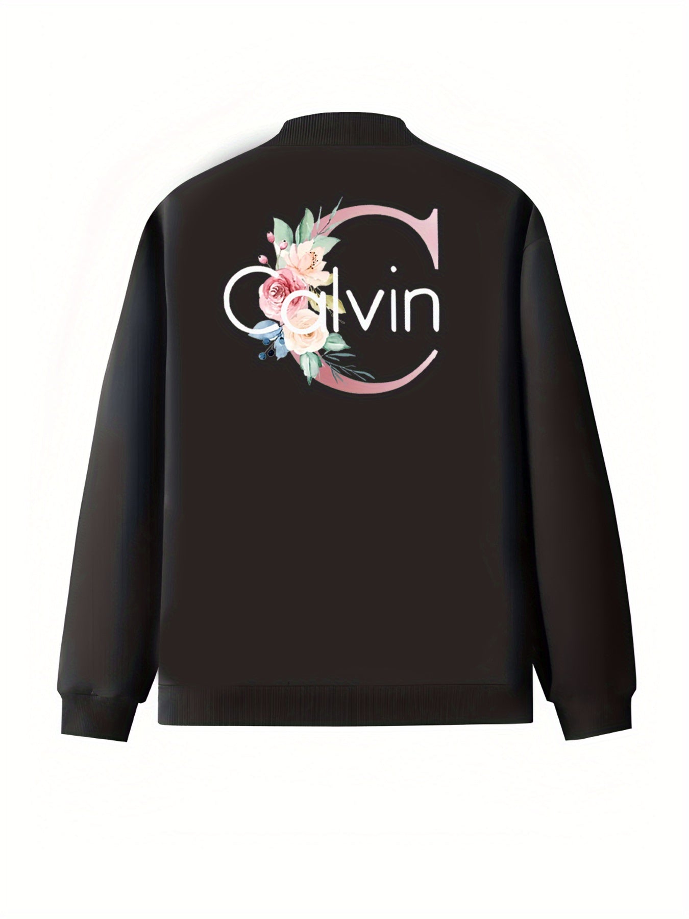 Plus Size Women's Casual Baseball Collar Jacket Black Floral Long Sleeve Pocket Outerwear