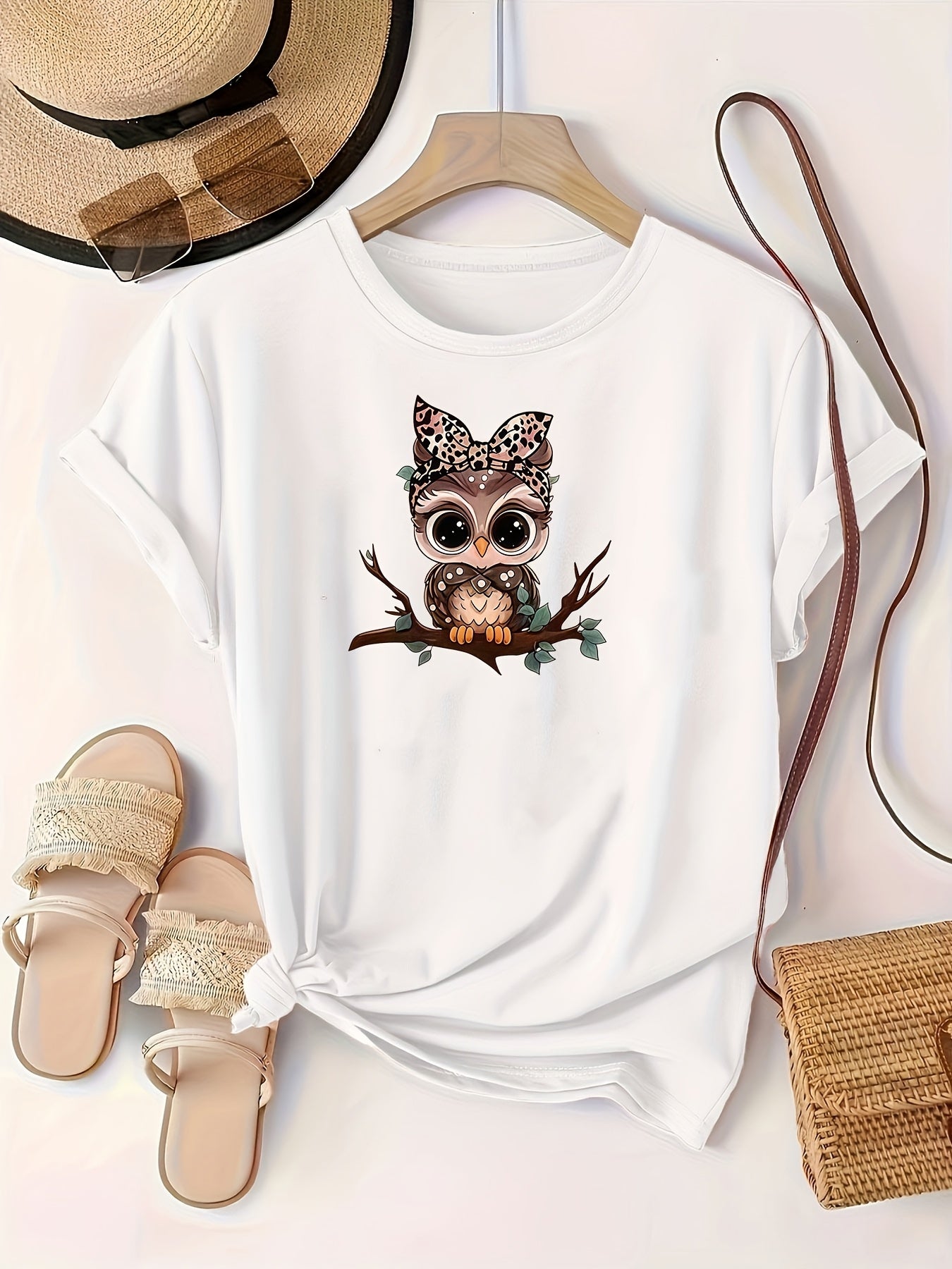 Plus Size Women's Cotton Short Sleeve T-Shirt Cute Owl Leopard Print Casual Top