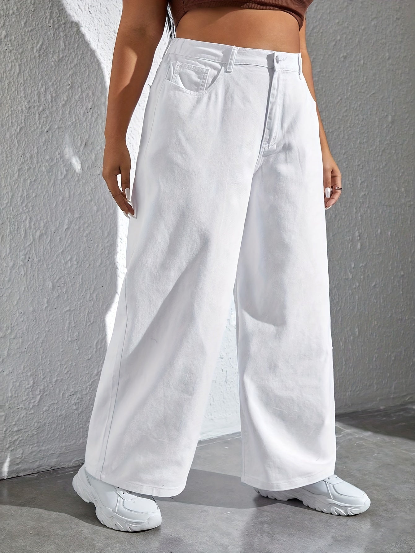 Plus Size Women's Wide Leg White Jeans with Slash Pockets Cotton Casual All-Season