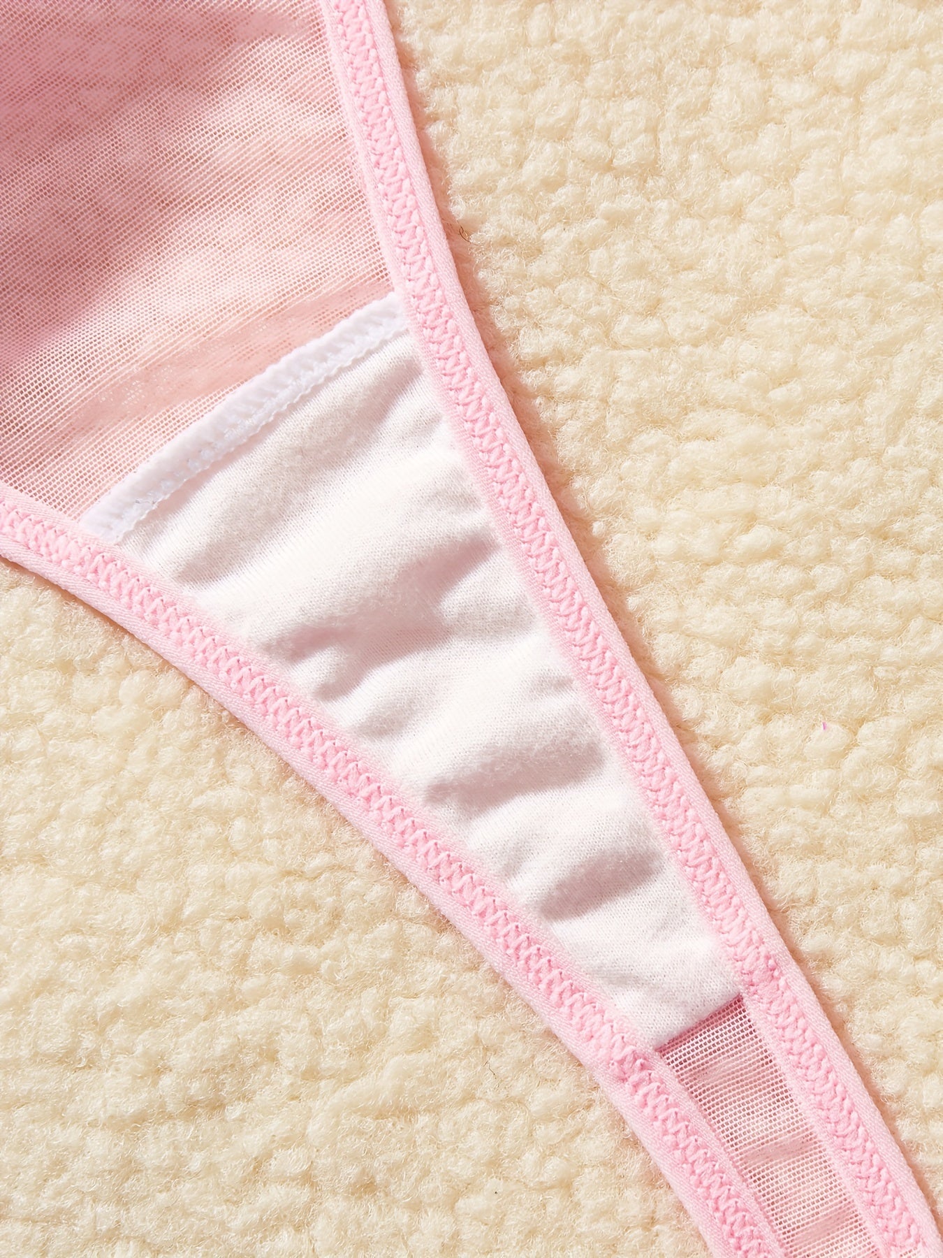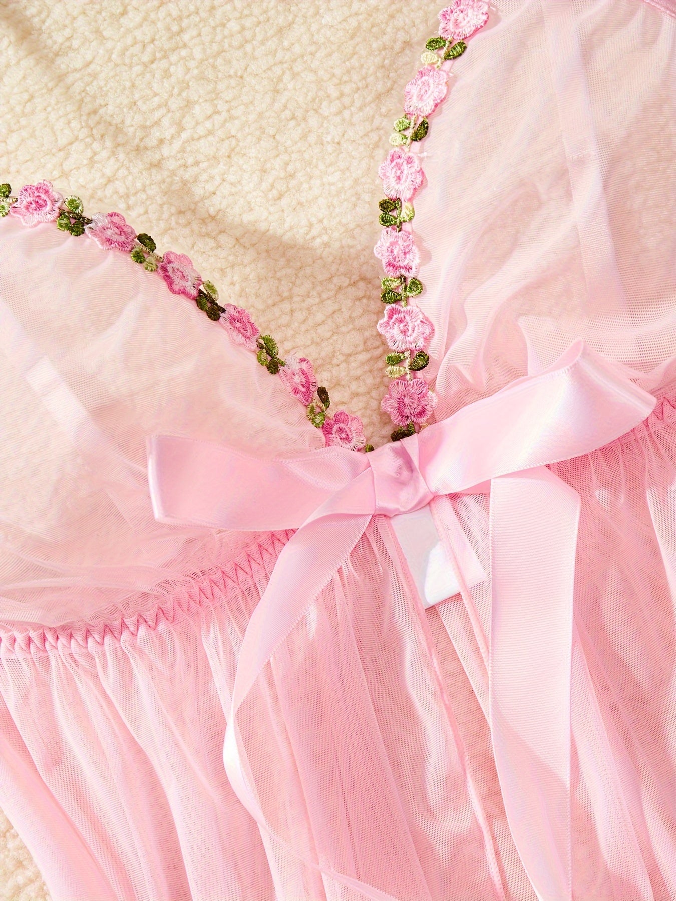 See-Through Mesh Lingerie Set with Floral Bow Pattern Deep V Slip Dress and Crotch Panty for Women