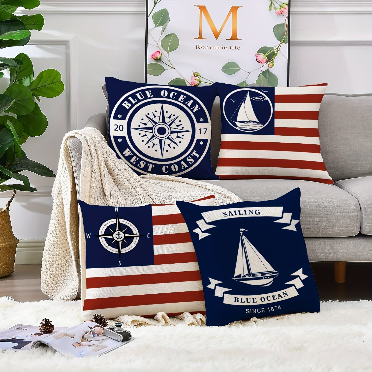 Set of 4 Nautical Polyester Linen Pillowcases Blue Sailboats Anchors Compasses 18x18 Inches
