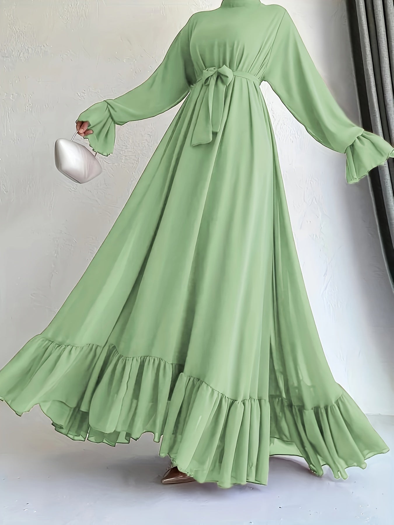 Solid Color Dress with Belted Ruffle Hem Long Sleeve Mock Neck for Spring and Fall