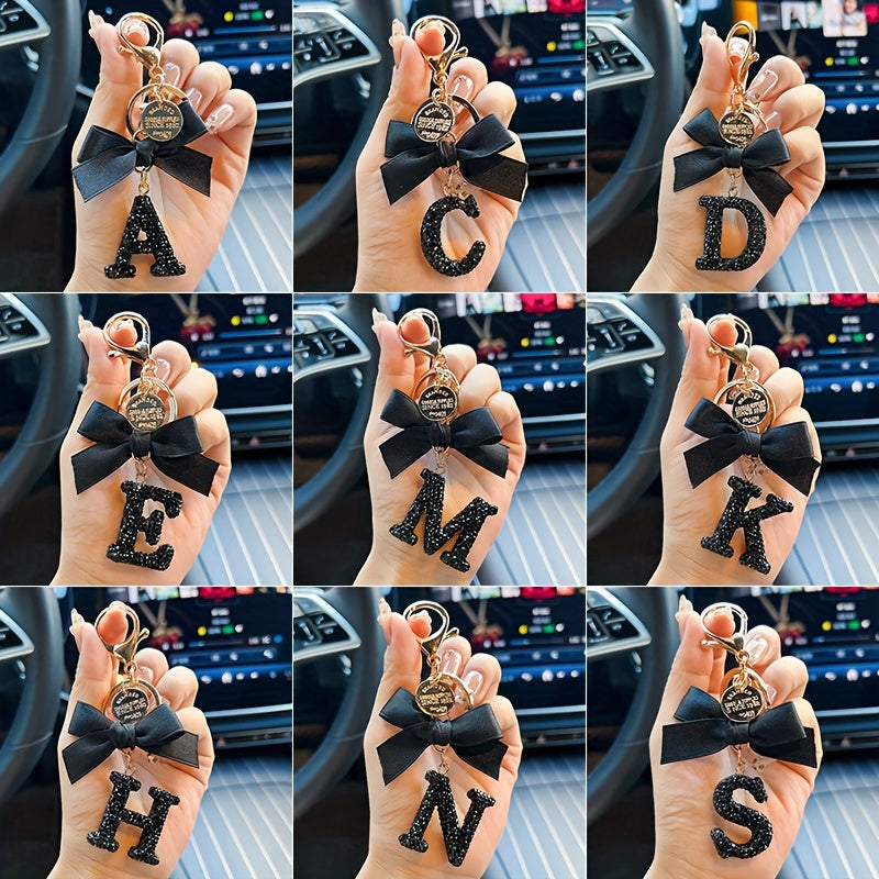 Black Bow and Rhinestone Alphabet Keychain Alloy Cartoon Charm for Bags and Cars