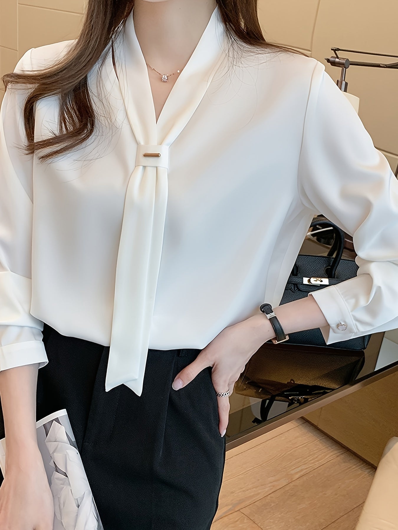 White Chiffon Blouse for Women Tie Neck Long Sleeve Solid Dressy Casual