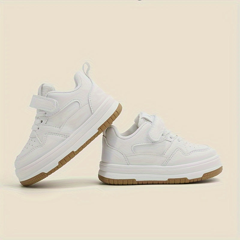 Kids' White Low Top Sneakers for Boys and Girls Adjustable Strap PU Upper Casual School Shoes