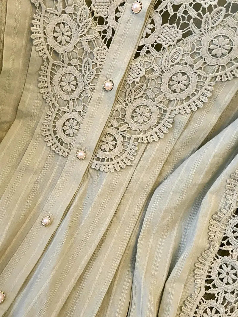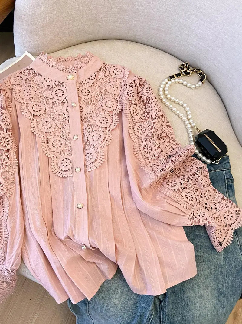 Women's Cotton Long Sleeve Shirt with Hollow Flower Panel and Stand Collar