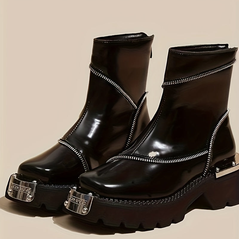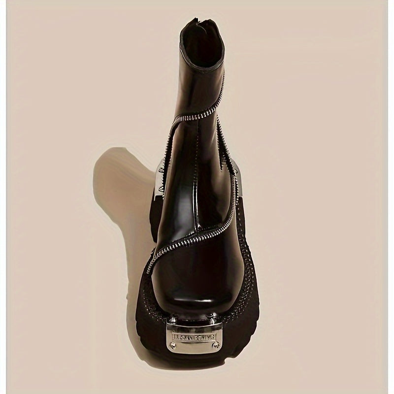 Women's Black Square Toe Ankle Booties with Zipper Platform Heel Rubber Sole
