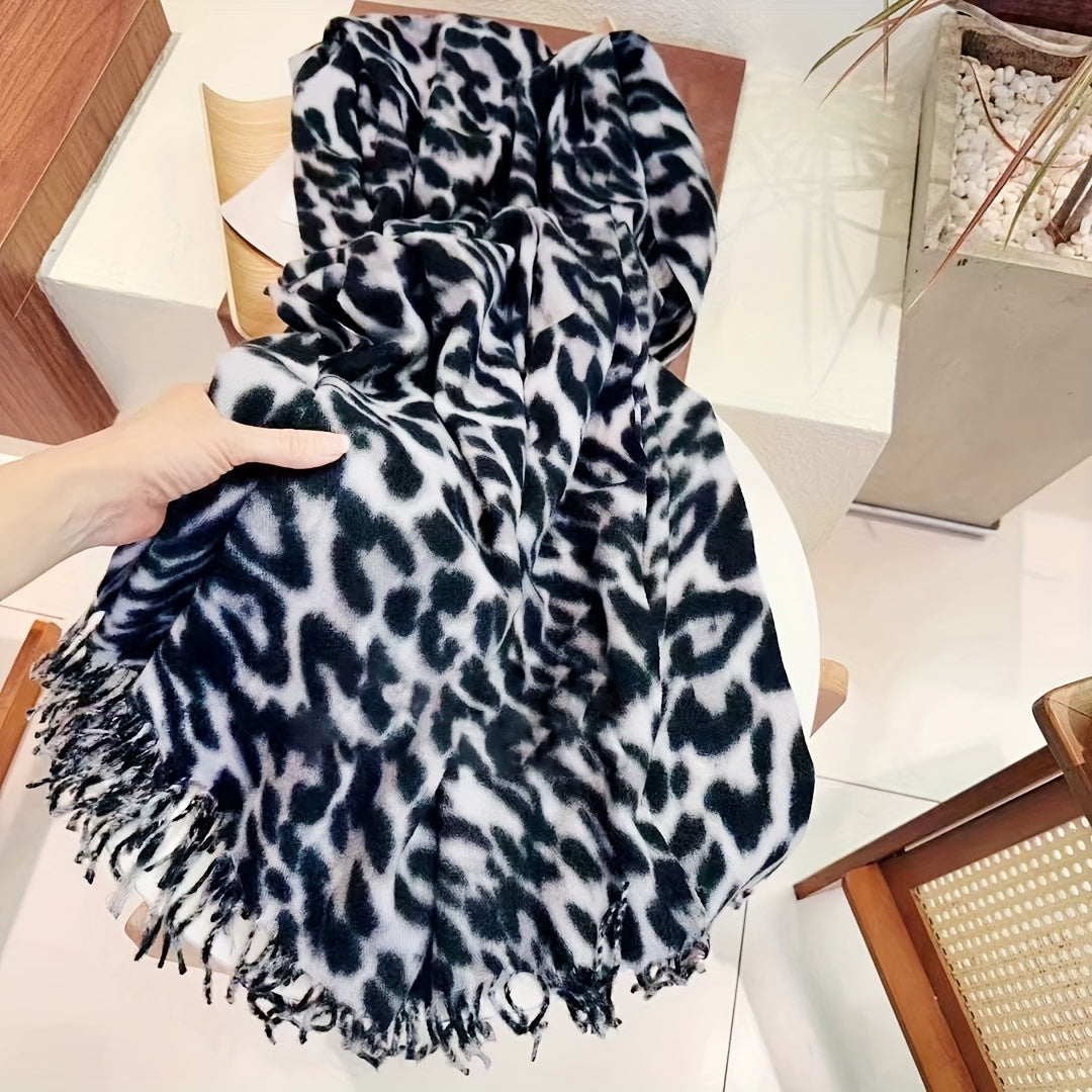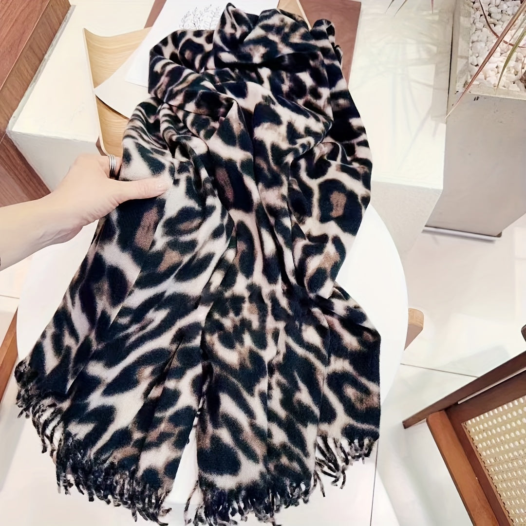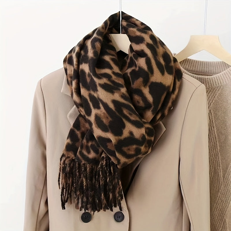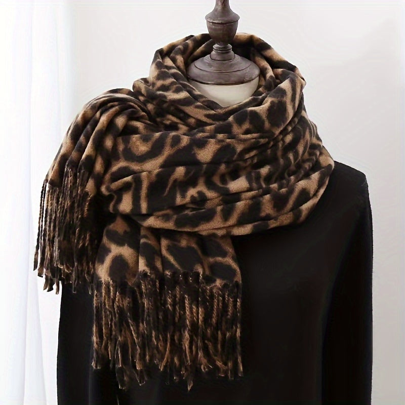 Leopard Print Faux Fur Scarf for Women Winter Cashmere Feel Tassels Warm Accessory