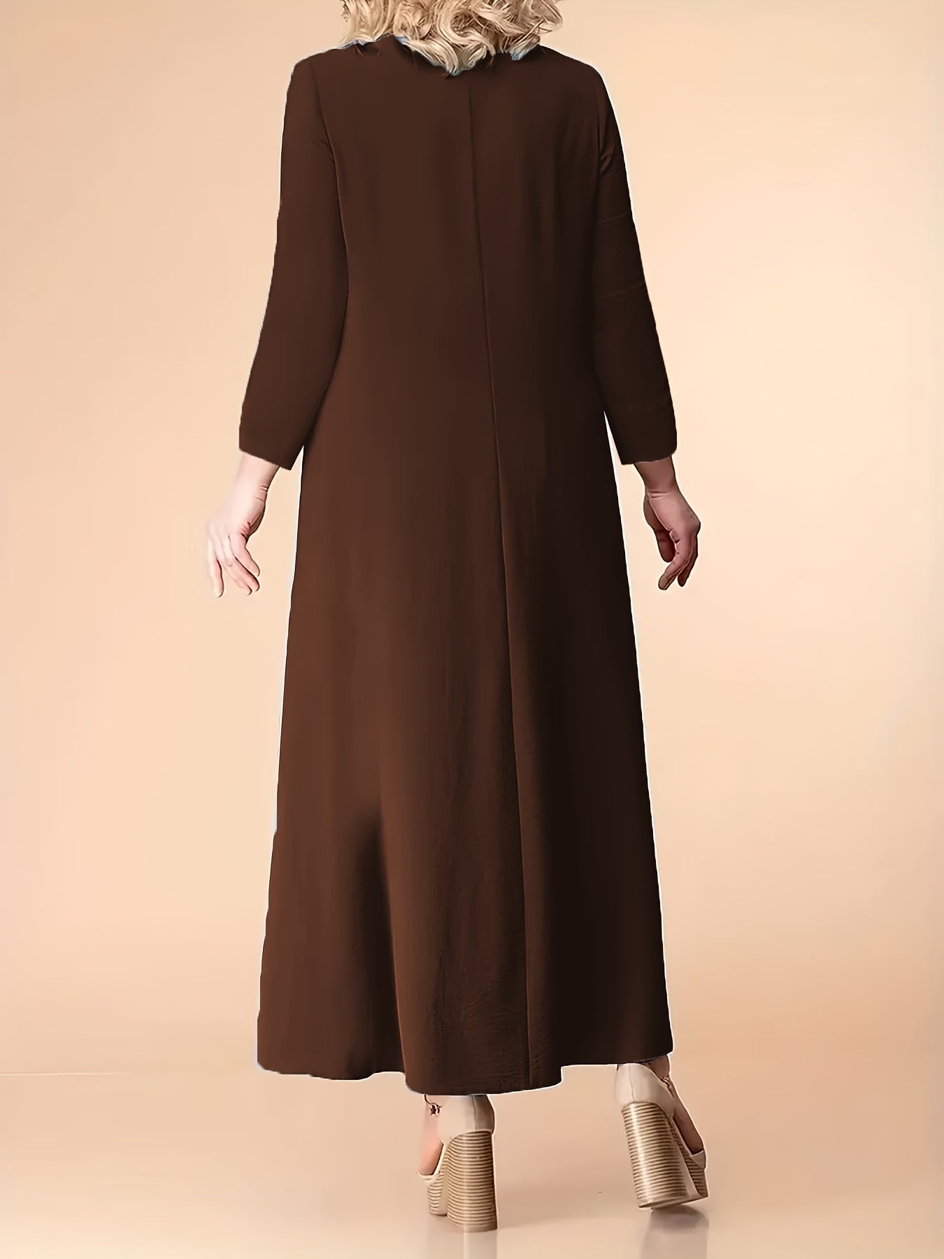 Plus Size Red Maxi Dress for Women with Long Sleeves Pockets Pleated Stretchy Polyester