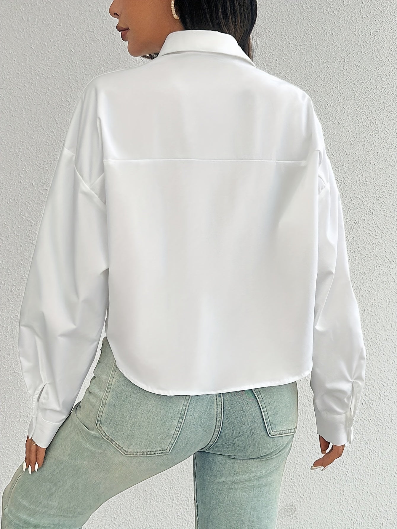 Women's White Casual Shirt Drop Shoulder Long Sleeve Short Style with Pocket Polyester