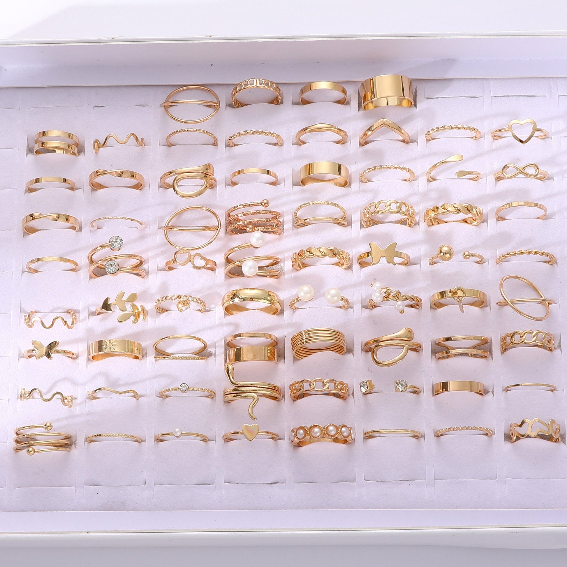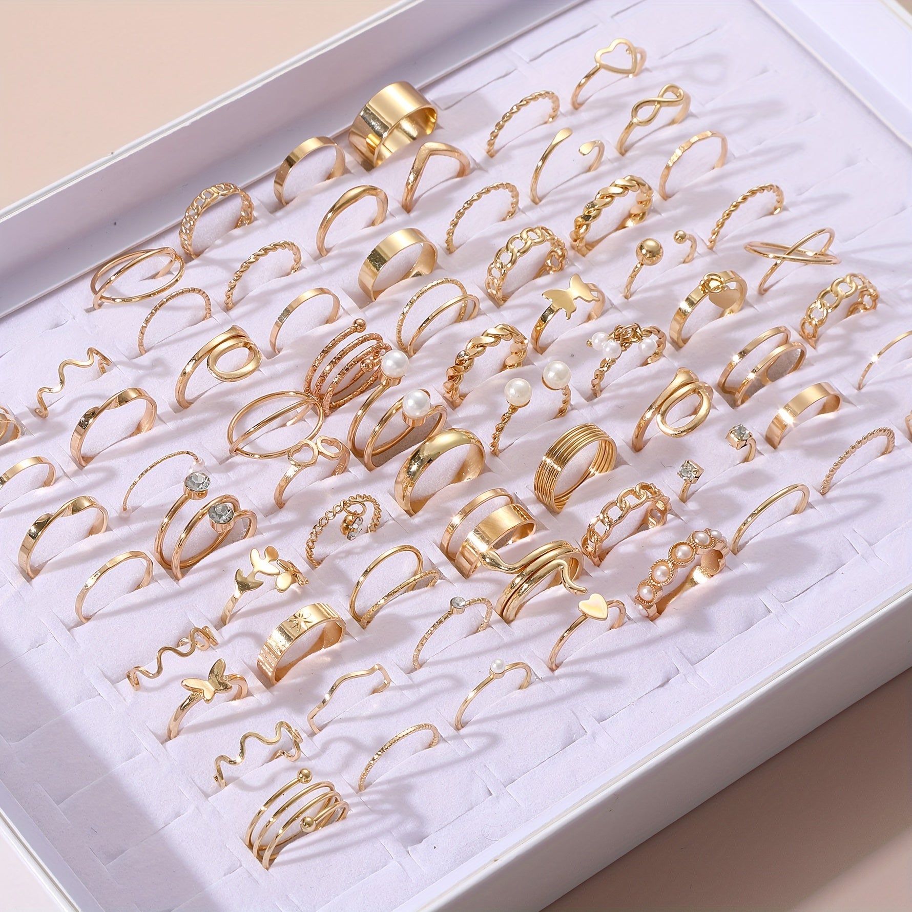 Stackable Ring Set with Faux Pearls and Cubic Zirconia in Gold Tone for Women