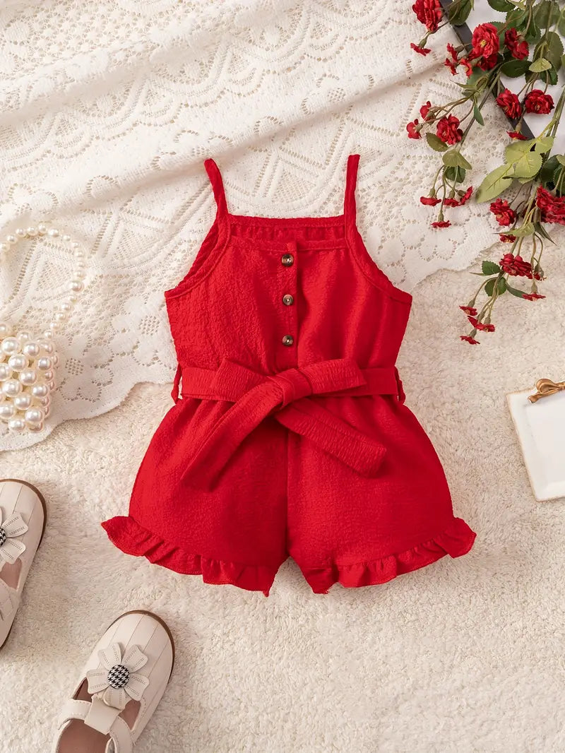 Baby Girl Bubble Romper Straps Solid Color All-Season with Belt for Toddler Learning to Walk