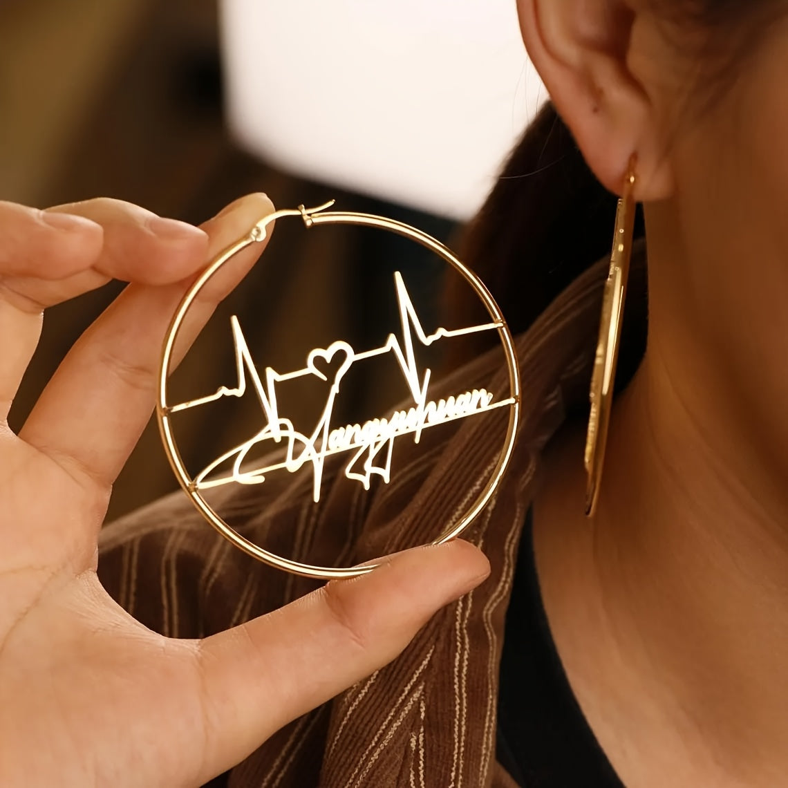 Personalized Heartbeat Earrings Gold-Toned Stainless Steel Hoop 70mm