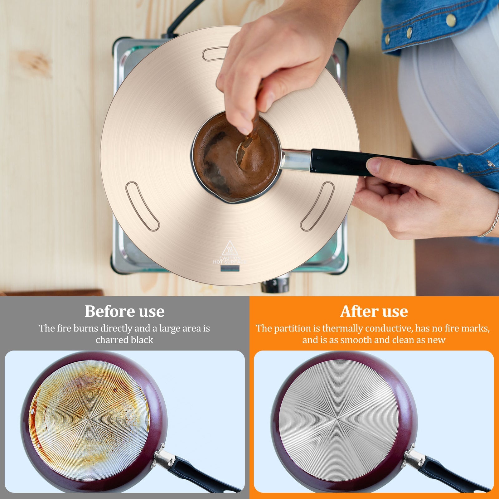 This kitchen tool is designed for practical use. It efficiently conducts and distributes heat, ensuring even heating. Additionally, it quickly dissipates heat and defrosts food, preventing sauces from burning in the pot. Even after being turned off, the circular heat conduction plate retains residual heat for continued warming.