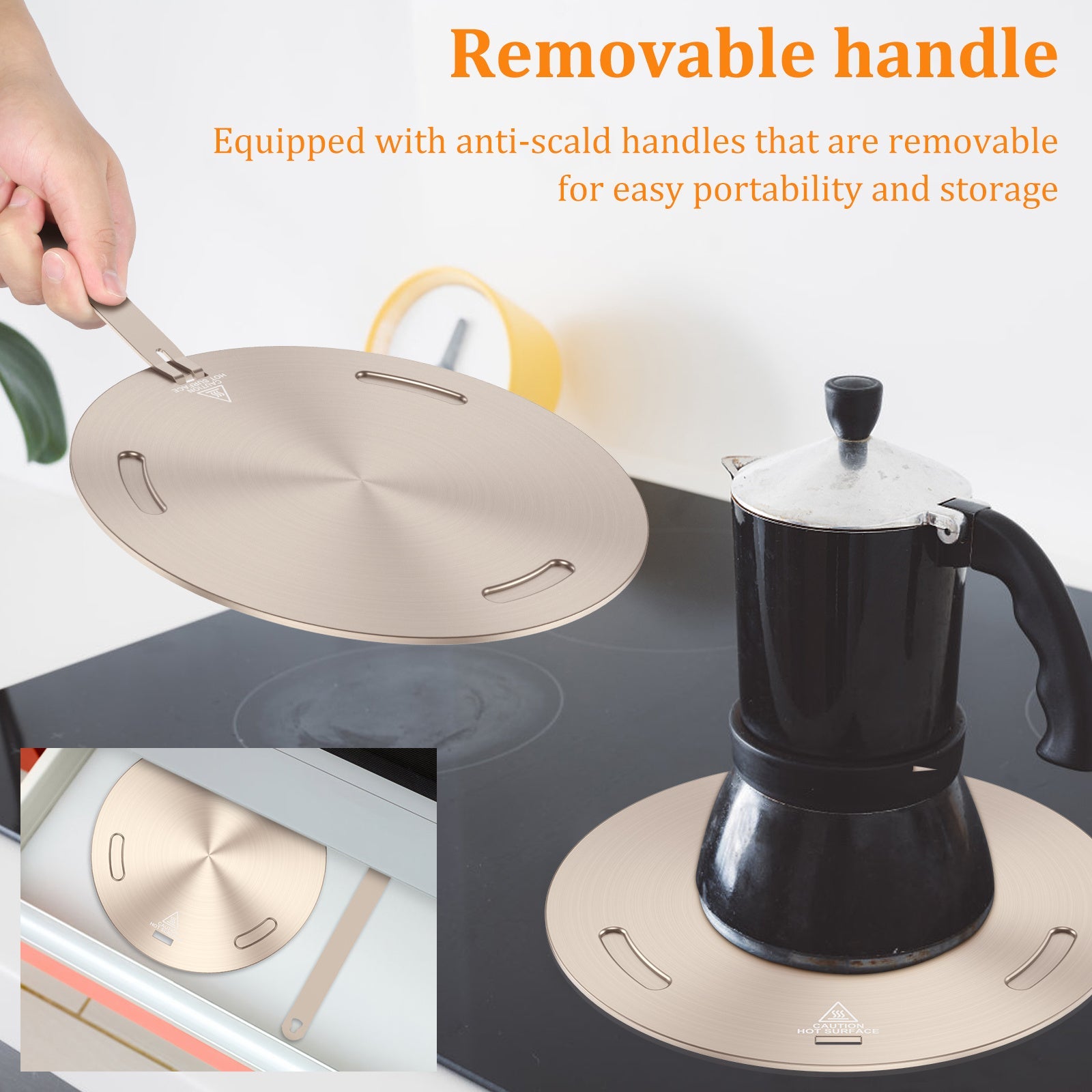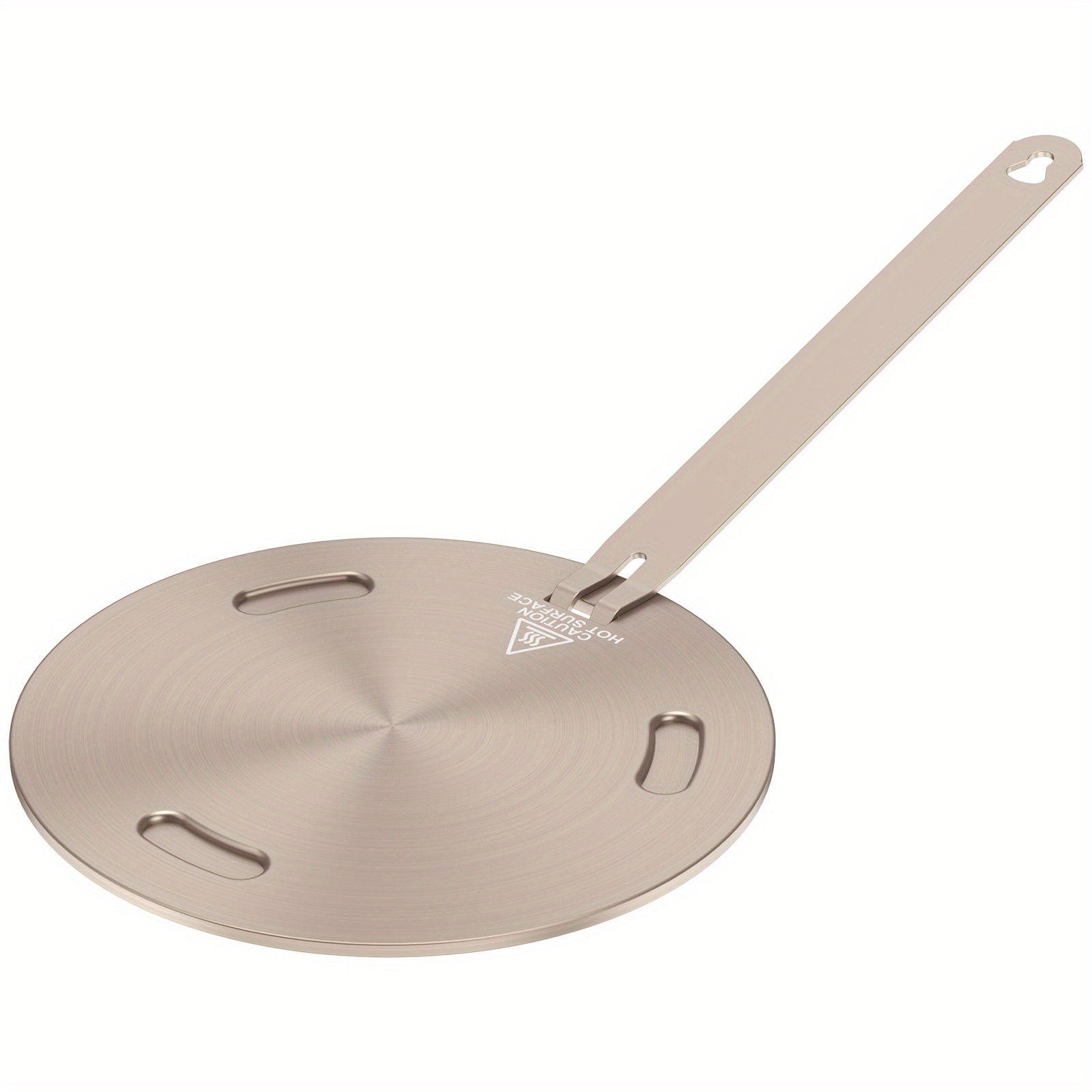 This heat diffuser plate includes a detachable handle for convenient carrying and storage. The handle also serves as a safety feature to prevent burns. Ideal for use in restaurant kitchens, home kitchens, and during camping or picnics. Note: Discoloration of the heat diffuser's surface after use is normal.