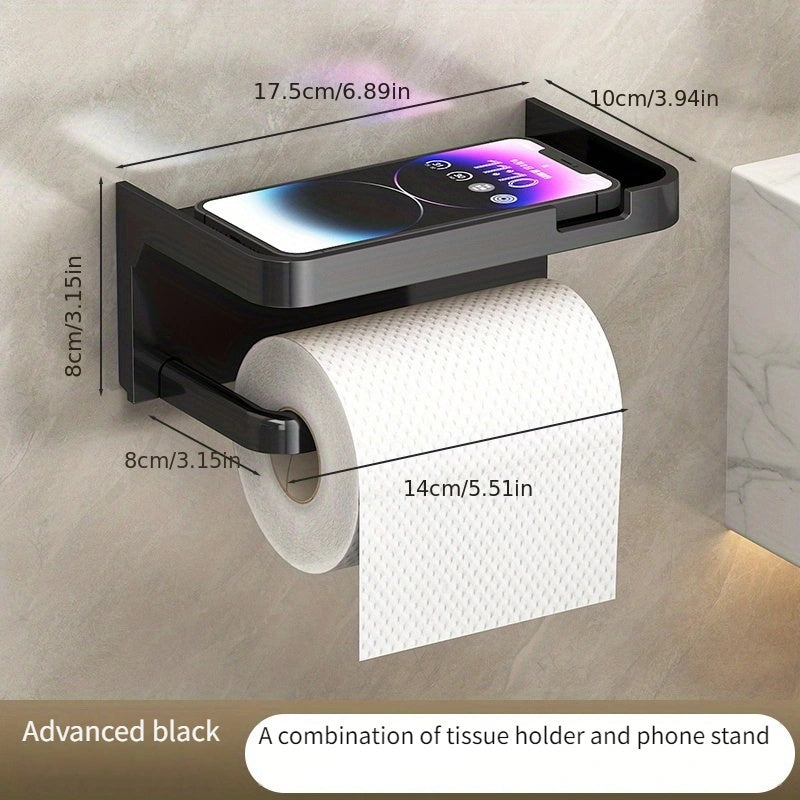 Wall-Mounted Bathroom Toilet Paper Holder with Shelves Matte Black Resin No-Drill Installation