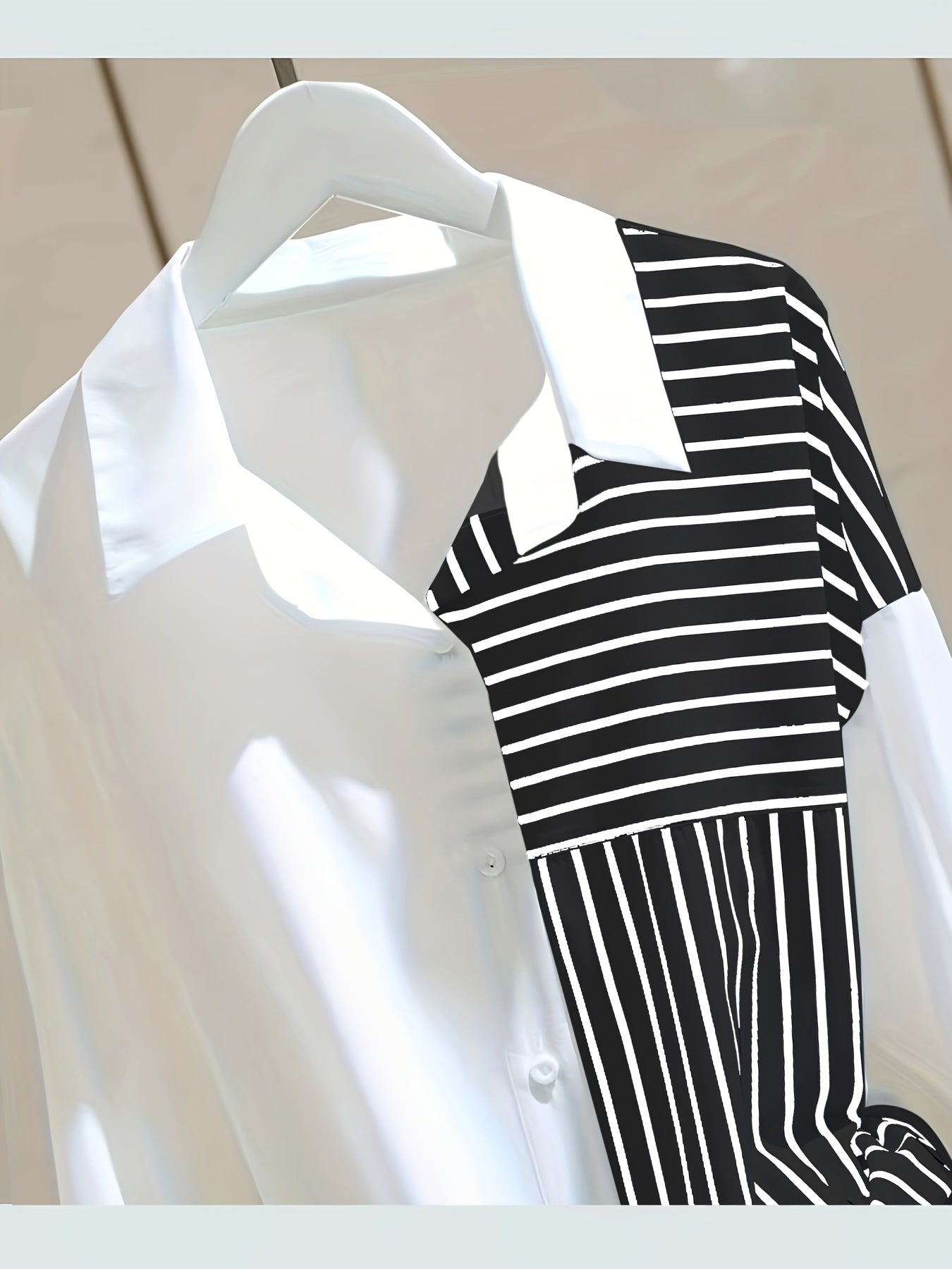 Women's White Loose-Fitting Shirt with Striped Patchwork for Spring and Autumn
