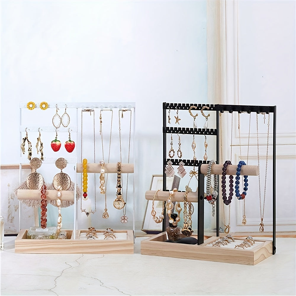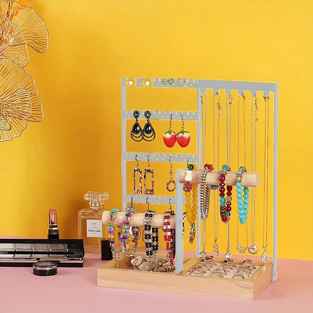 White Wooden Jewelry Organizer Stand with 5 Tiers and Iron Necklace Hooks