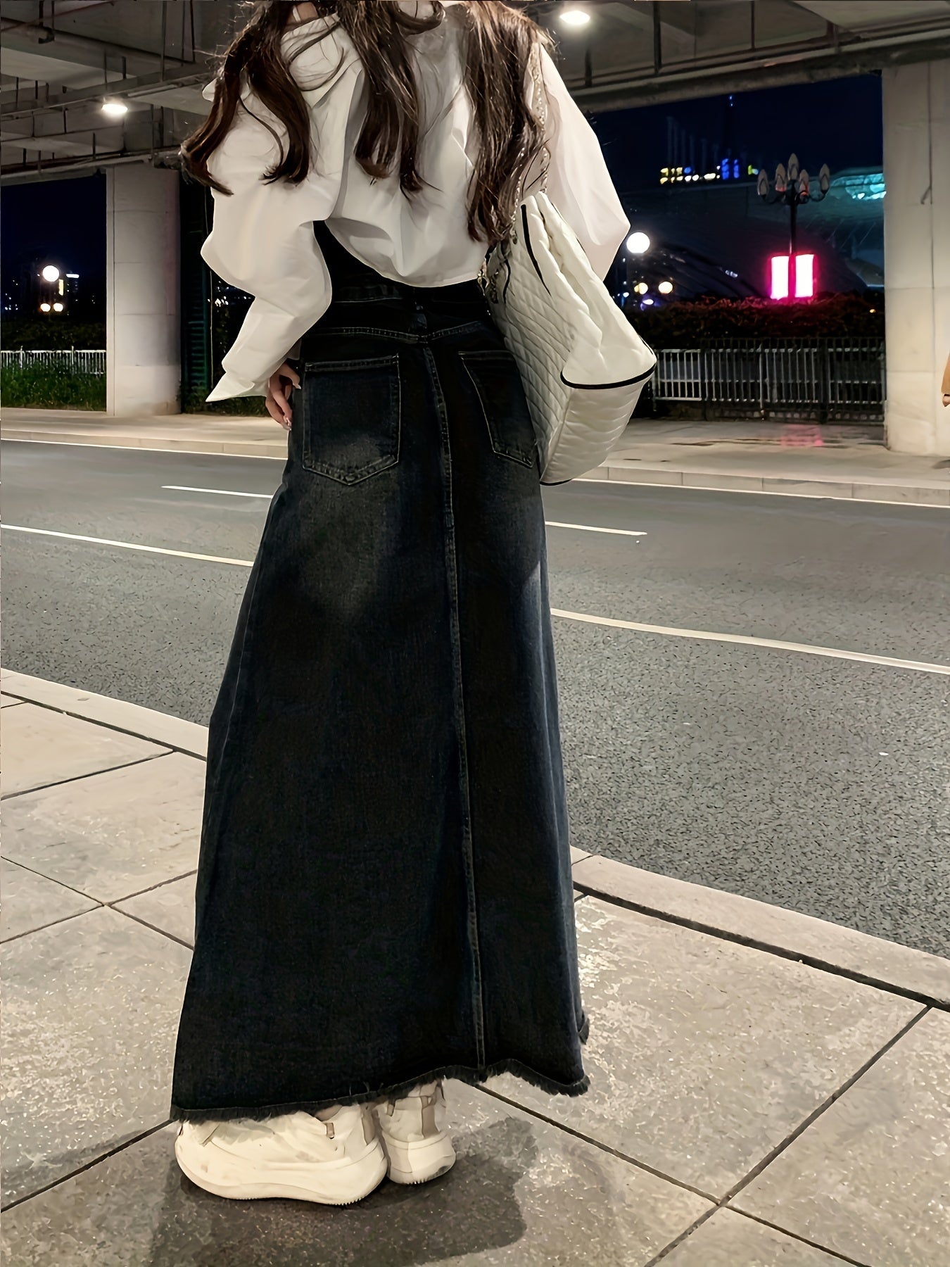 Women Denim Midi Skirt High-Waist Button Frayed Hem Casual Spring Summer Fall