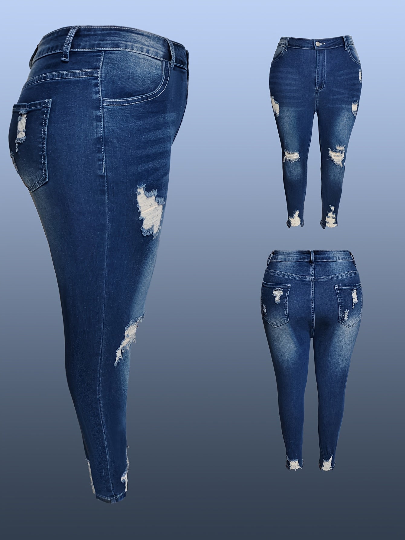 Women Plus Size High Waist Blue Ripped Skinny Jeans with Stretchy Fabric