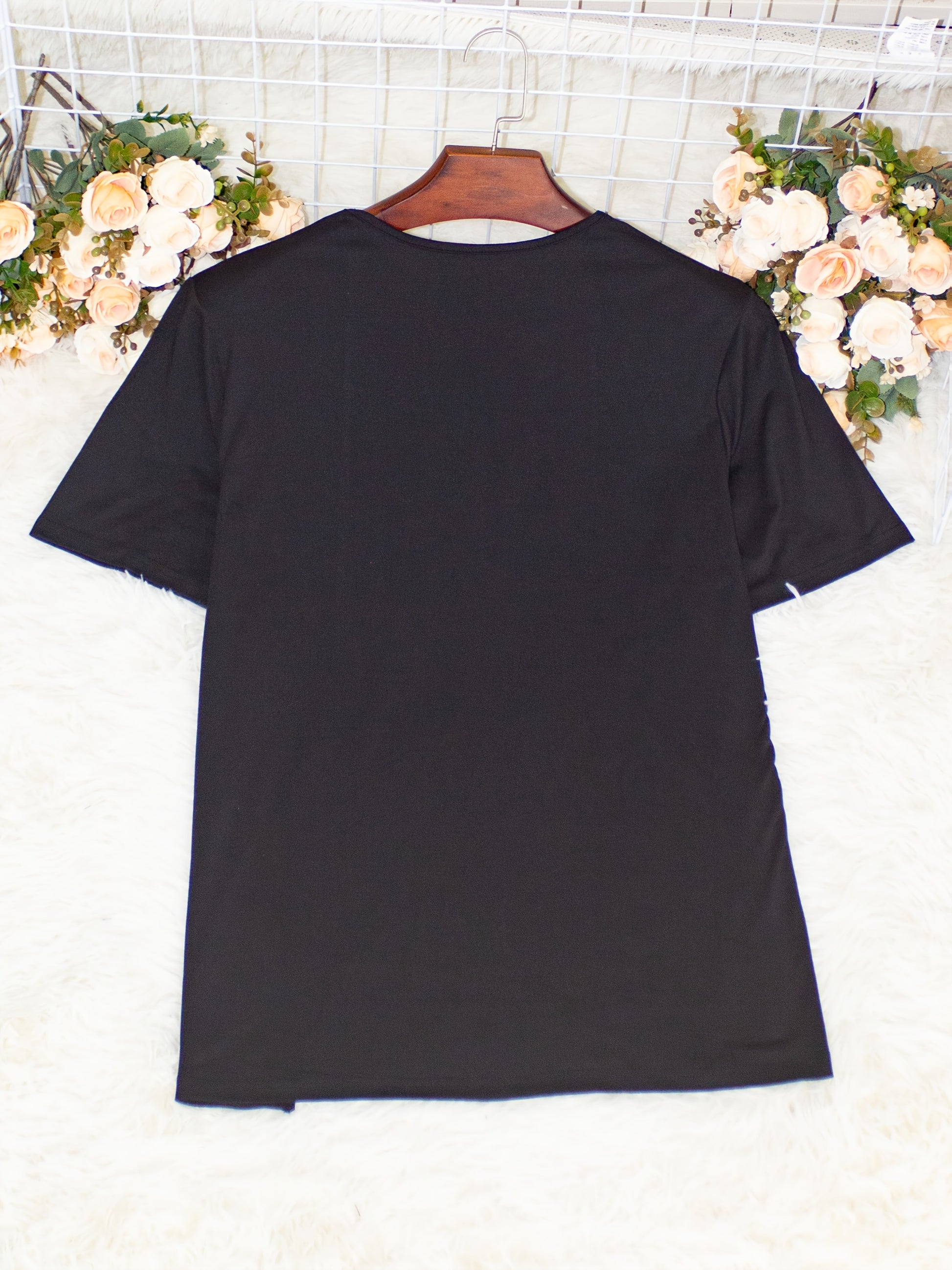Women Plus Size V-Neck Short Sleeve T-Shirt with Galaxy Print Red Black
