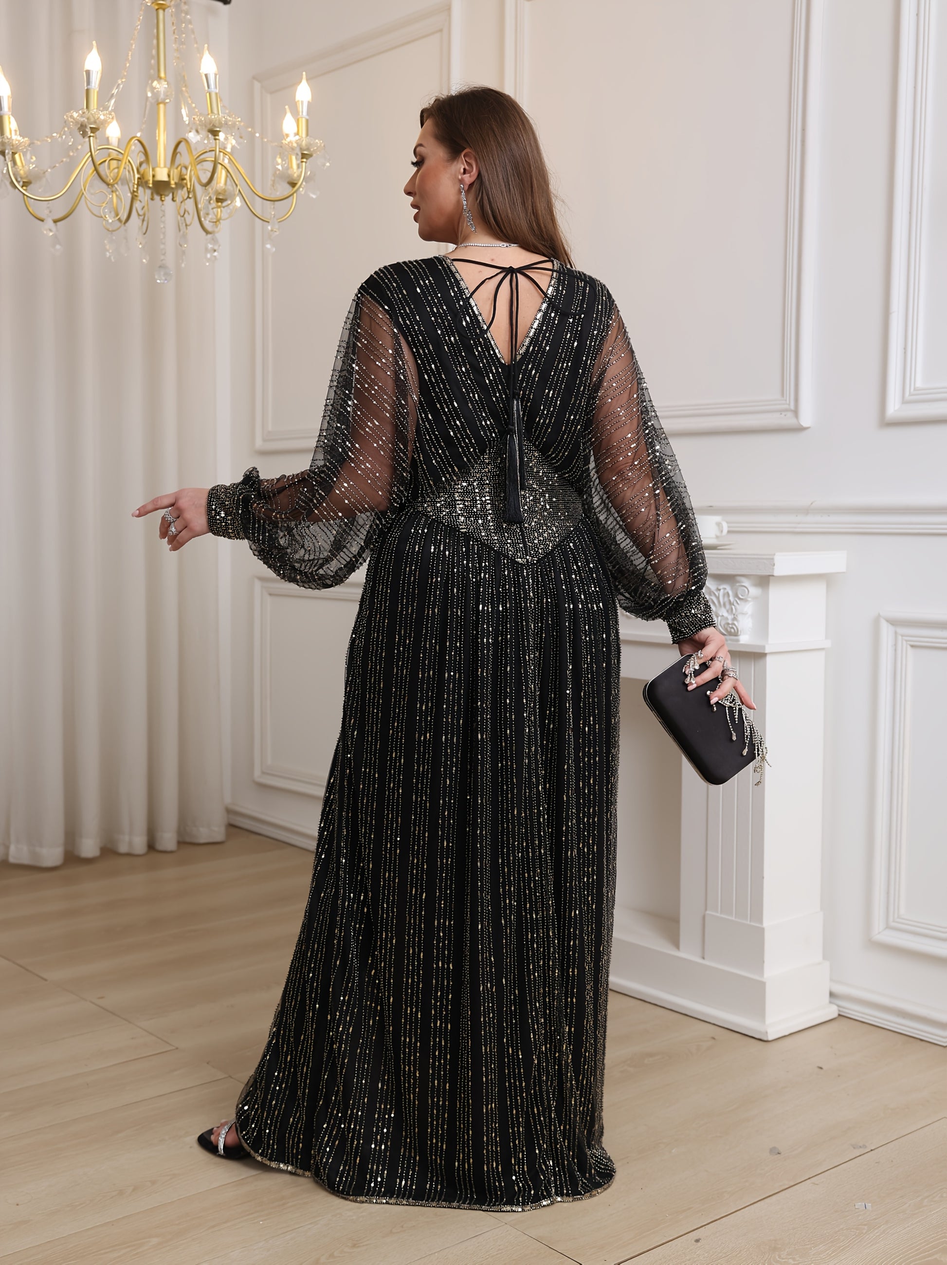 Women's Beaded Sequin V-Neck Batwing Sleeve Midi Dress Formal Party Wear