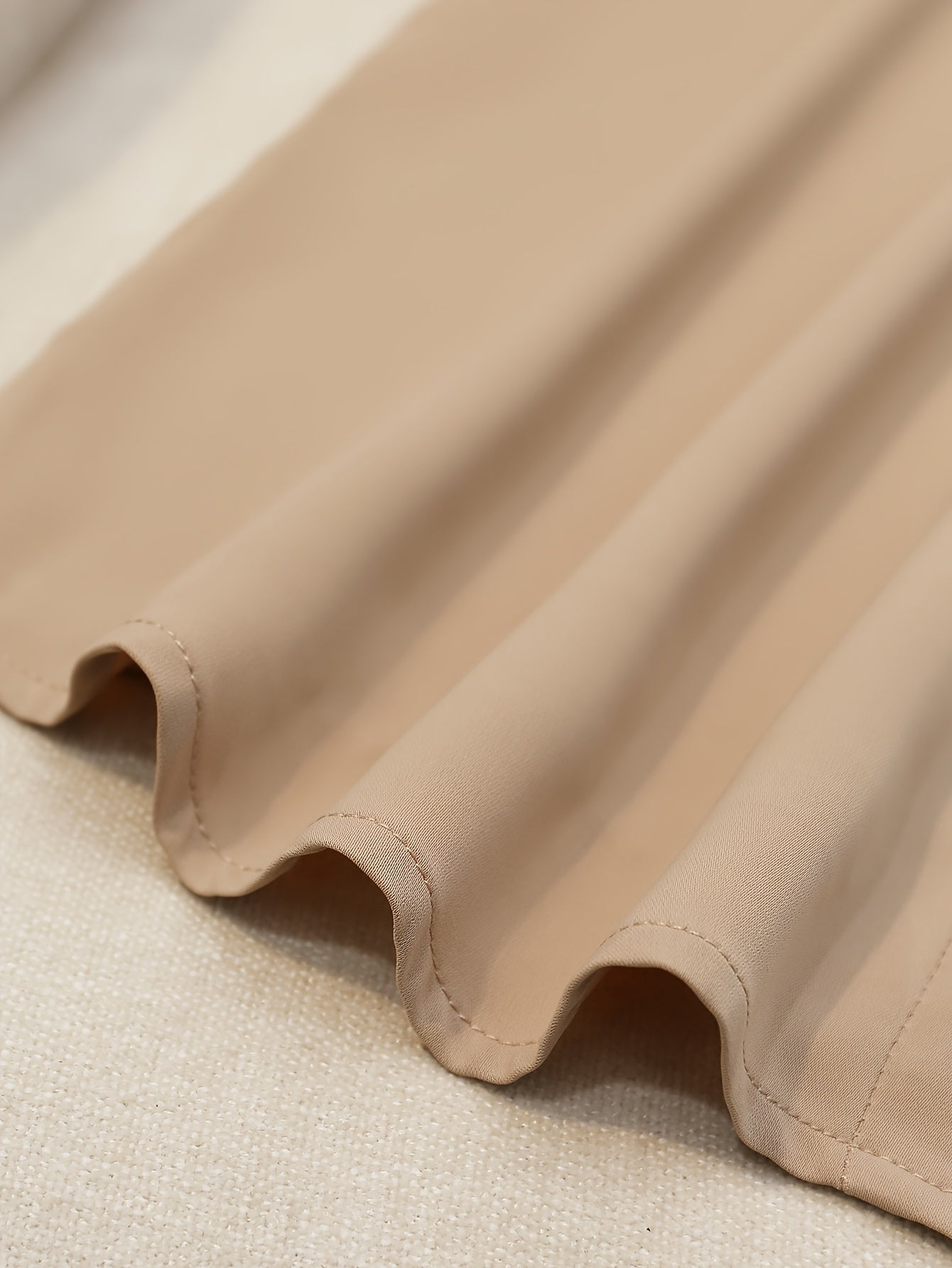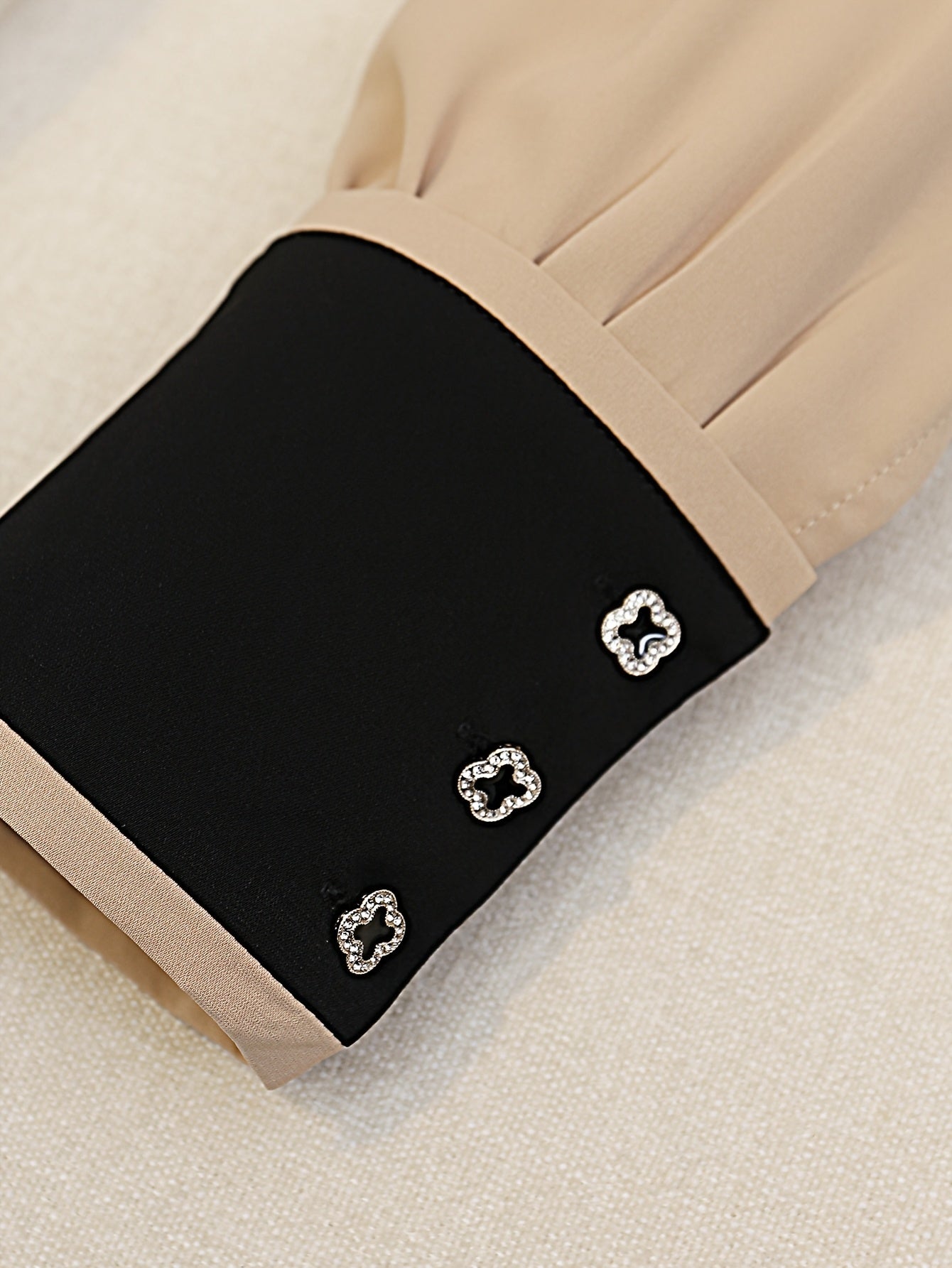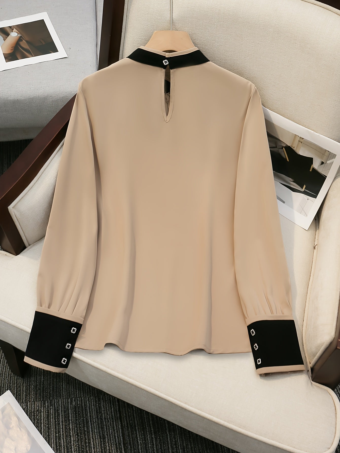Women's Beige Blouse with Black Ruffle Trim Contrast Collar Long Sleeve Polyester All-Season Elegant Top