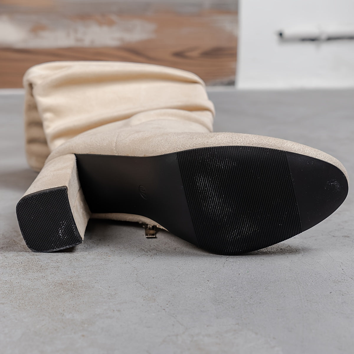 Women's Beige Mid-Calf Boots With Side Zipper and Chunky Heel